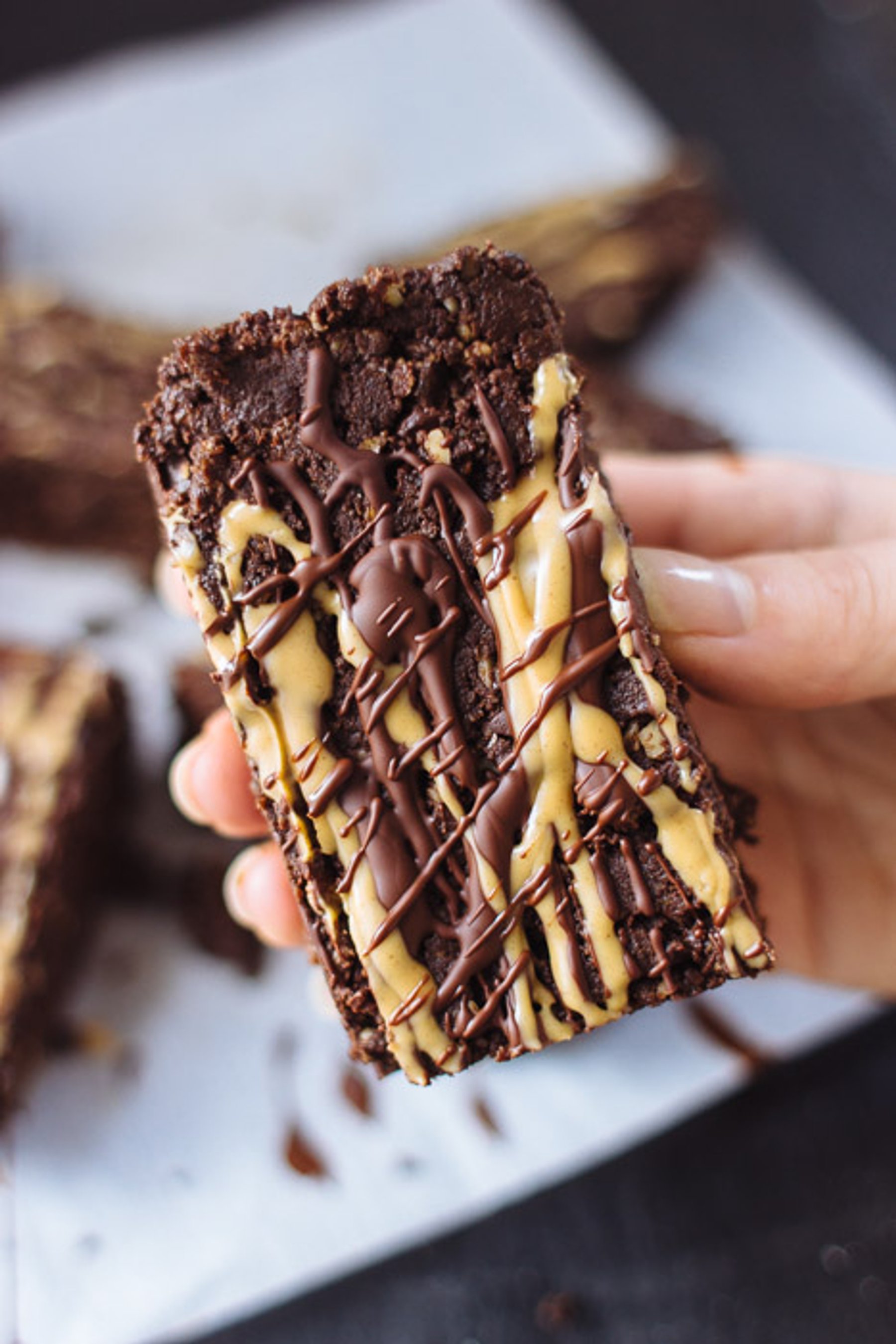 Incredible no-bake brownies sweetened with dates and honey and topped with peanut butter and chocolate drizzle! Click through for the full recipe!