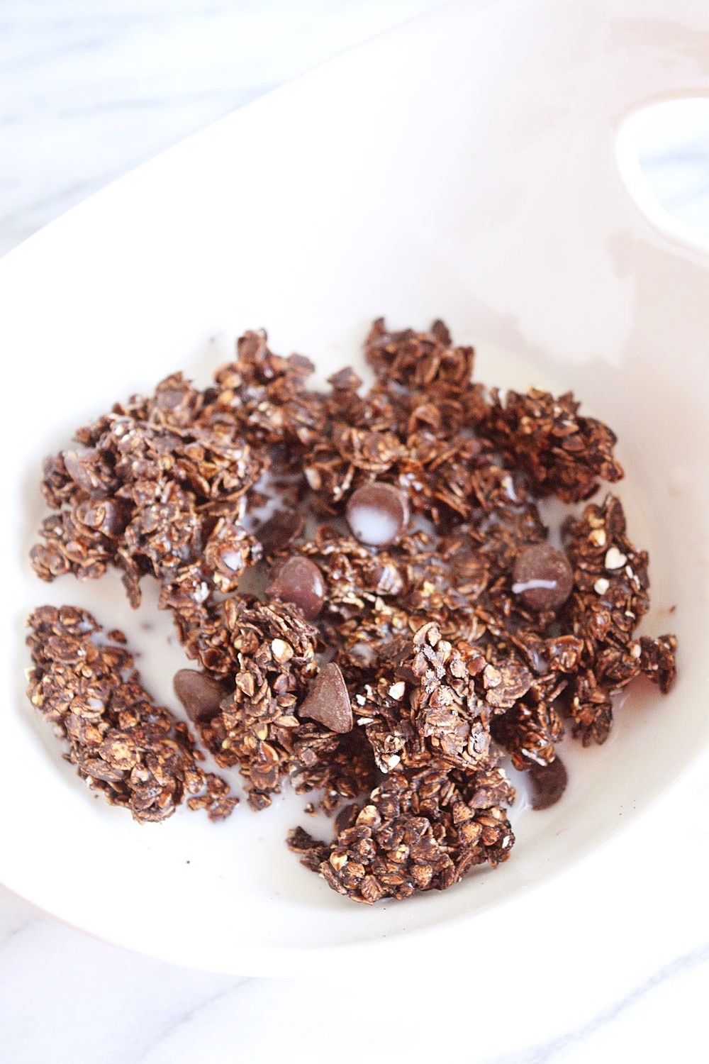 Vegan nut free chocolate granola is crunchy, sweet, and full of deep chocolate flavor! Made with just 4 healthy ingredients, it's totally gluten free, oil free, and nut free.