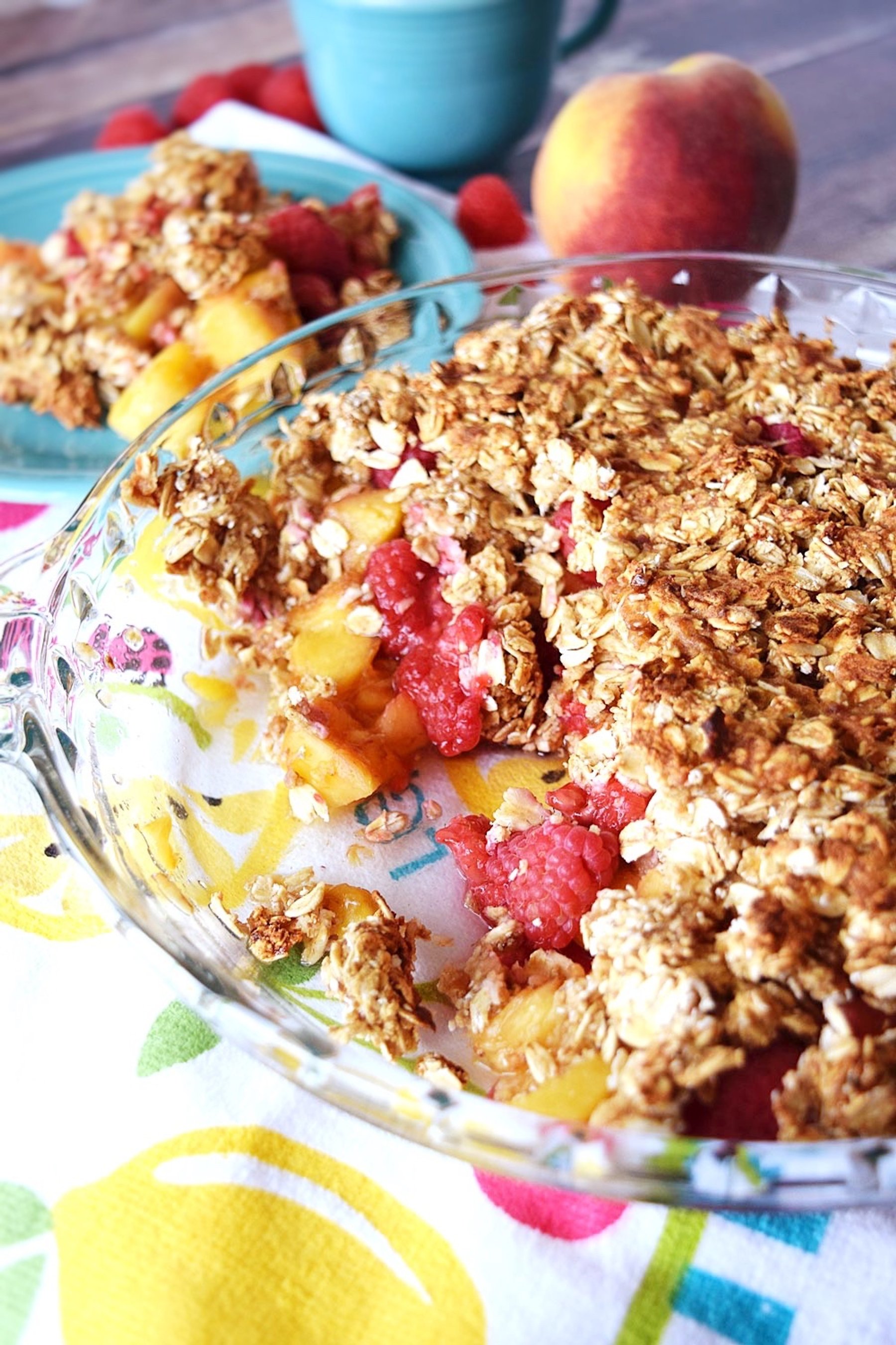 Juicy peaches and tart raspberries topped with a sweet crumble! This vegan peach raspberry crumble is a spring dessert dream. This recipes is healthy, gluten free and naturally sweetened.