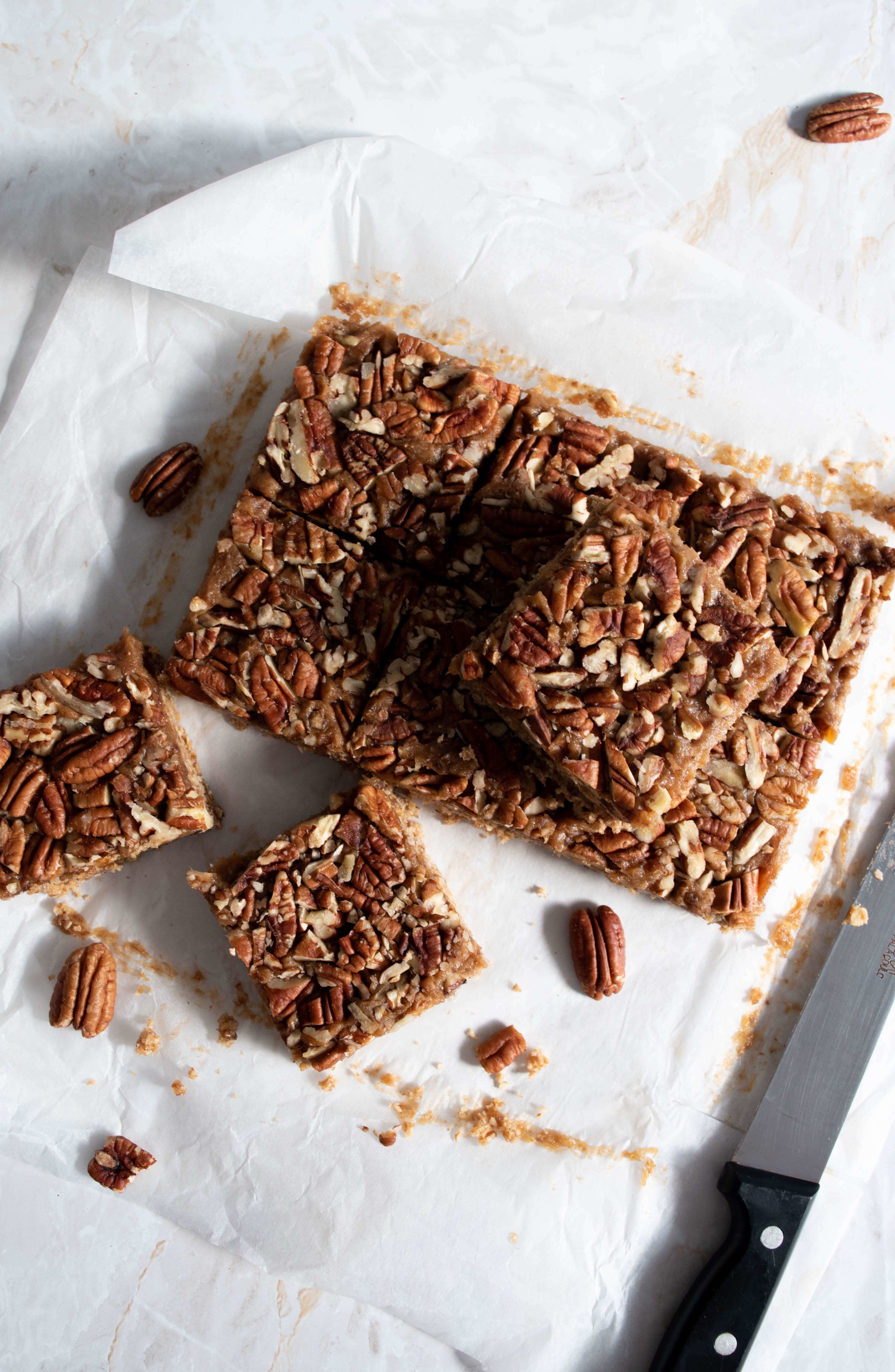 These vegan pecan pie bars are super indulgent, easy to make and require no baking. They're perfect for a pick-me-up afternoon snack or a delicious dessert after dinner. These are sugar-free, gluten-free and dairy-free, but still incredibly good!