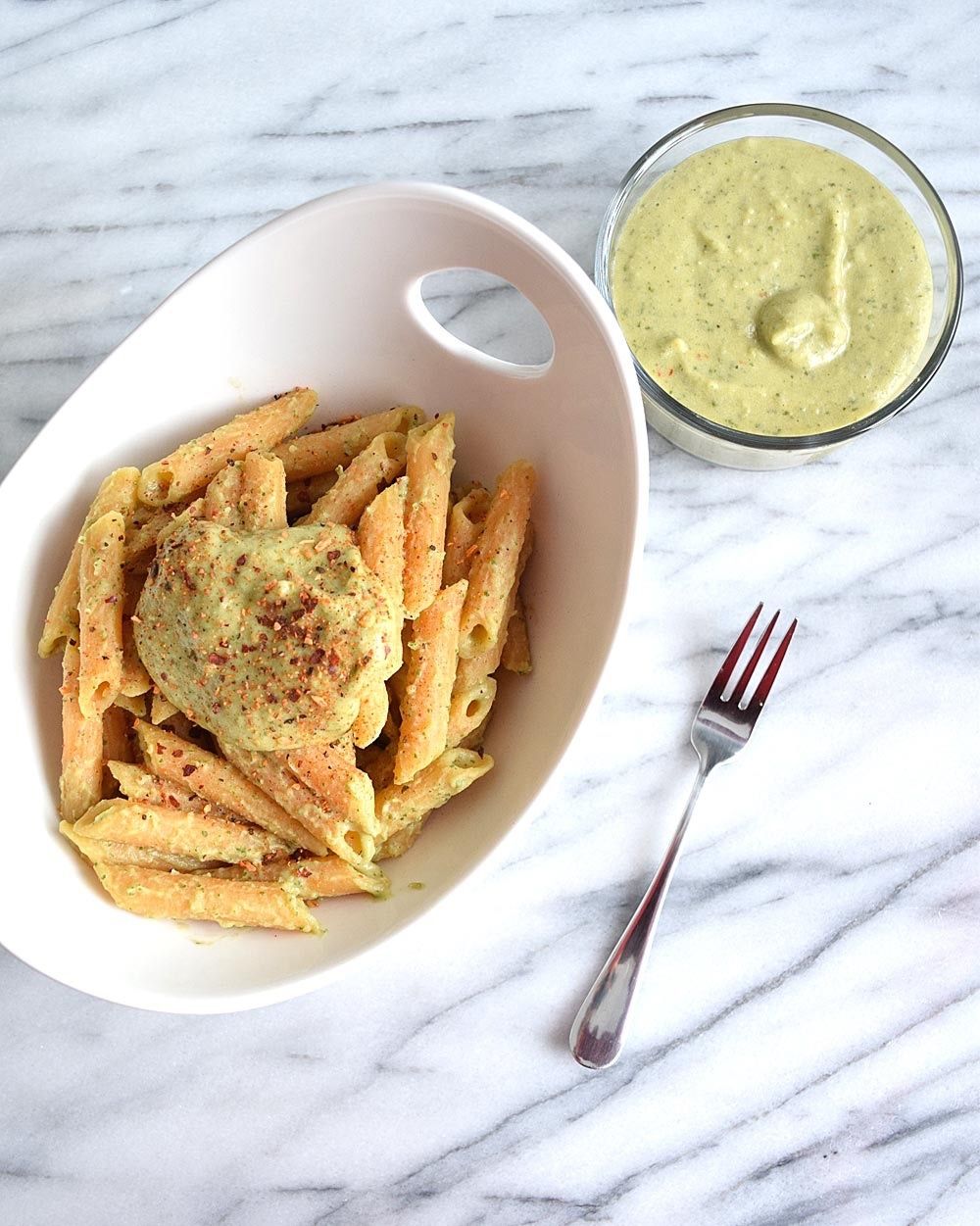 Vegan pesto pasta is a healthy and super satisfying dinner. The pesto is totally oil and nut free, and so rich and creamy!