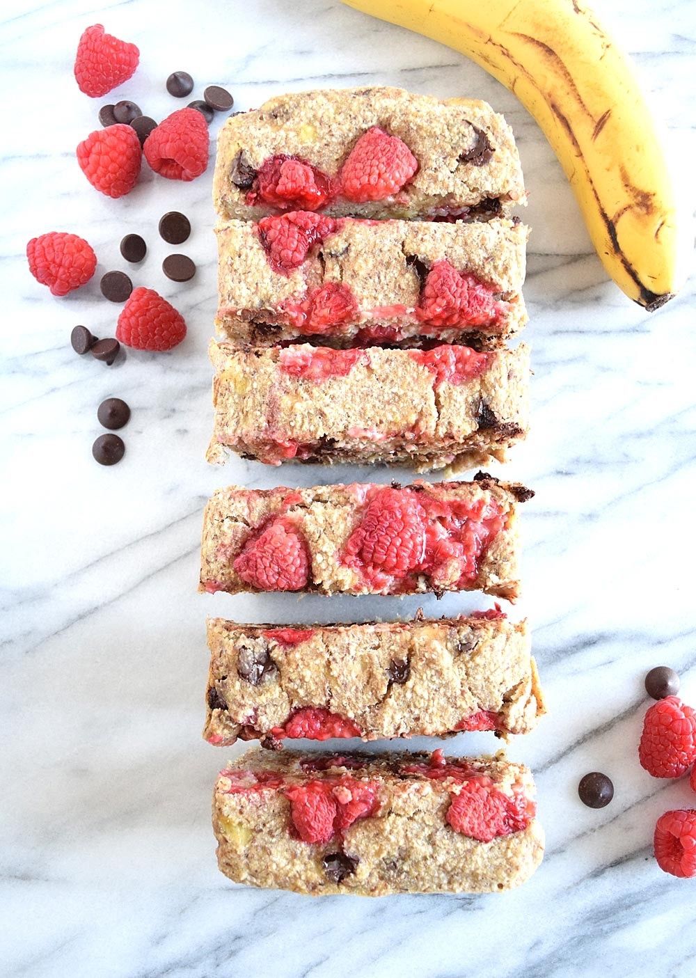 Vegan raspberry chocolate chip banana bread is everything you want in rich, sweet banana bread, plus tart raspberries and melty chocolate chips! Totally gluten free and banana sweetened.