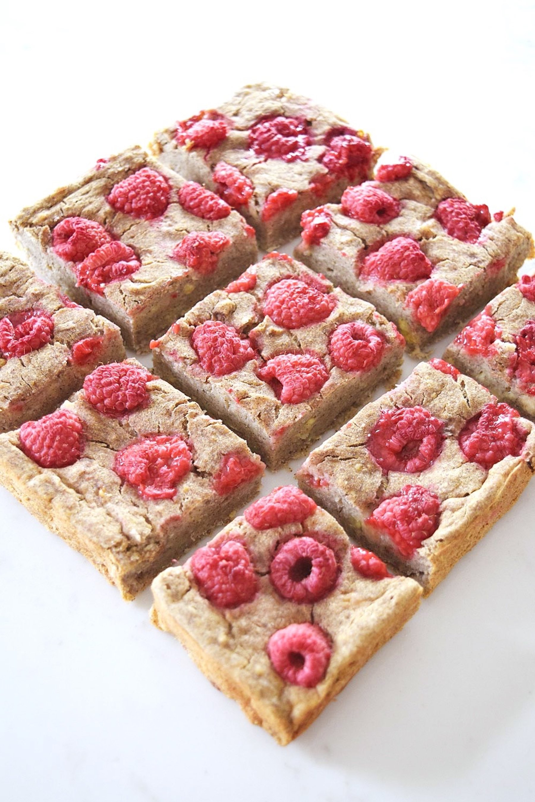 Soft and sweet banana bars loaded with tart, juicy raspberries. The perfect summertime snack! Vegan raspberry banana bars are super easy, made with just 5 healthy ingredients, and they’re gluten free and totally fruit sweetened.