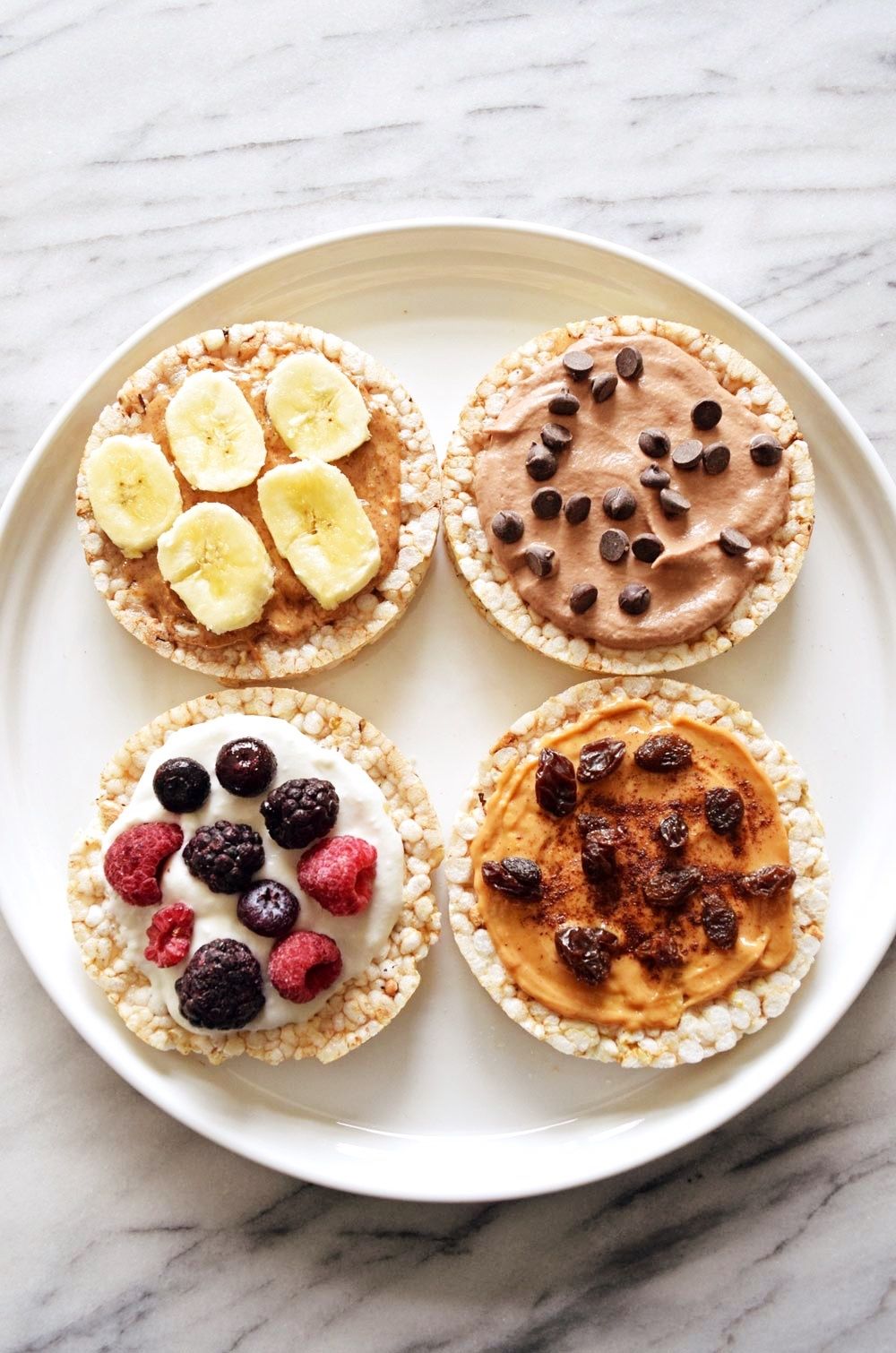 Vegan rice cake toasts, 4 different ways! These sweet combinations all make a great healthy, quick snack.