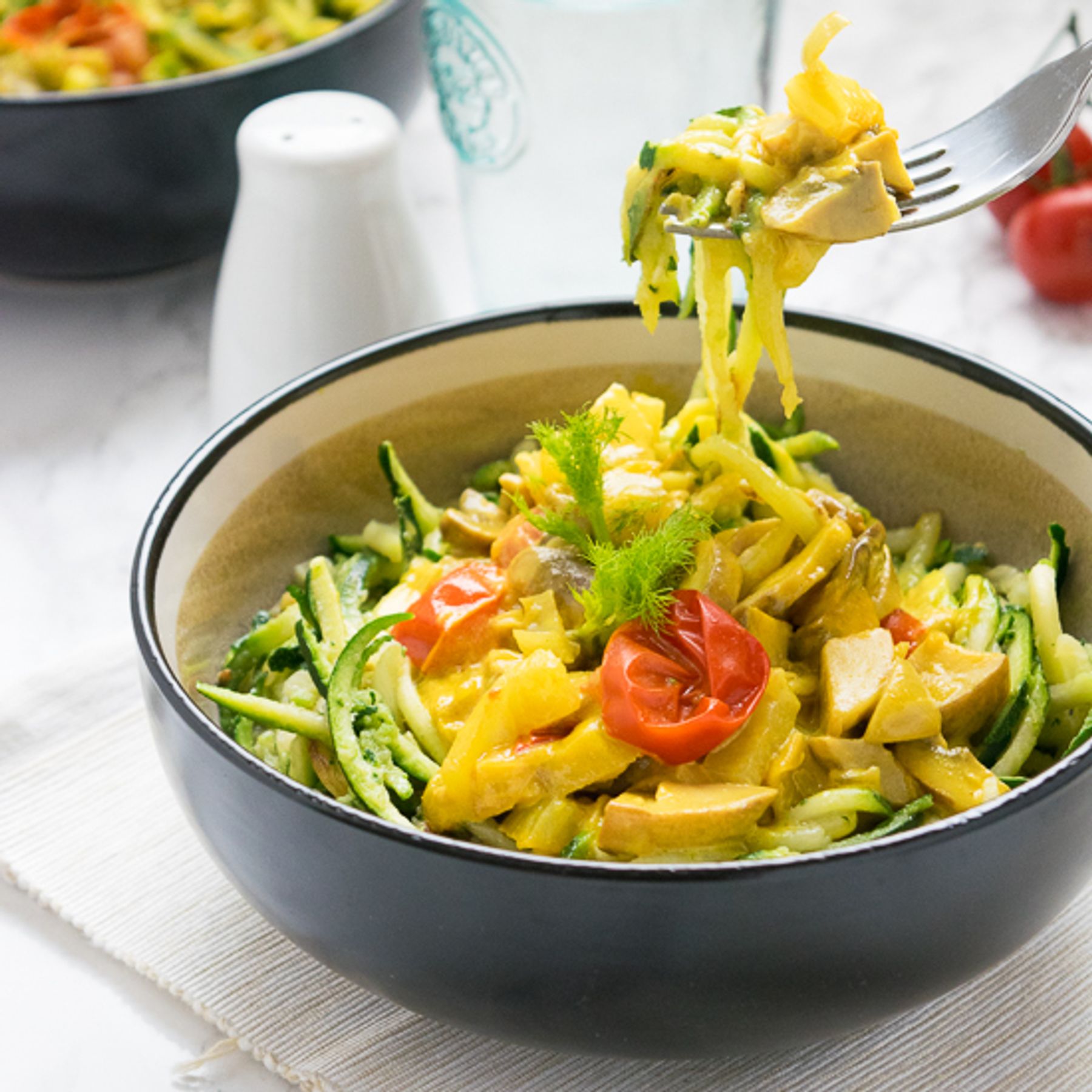 Vegan Spiralized Courgette Pasta with Creamy Mushroom Turmeric Sauce