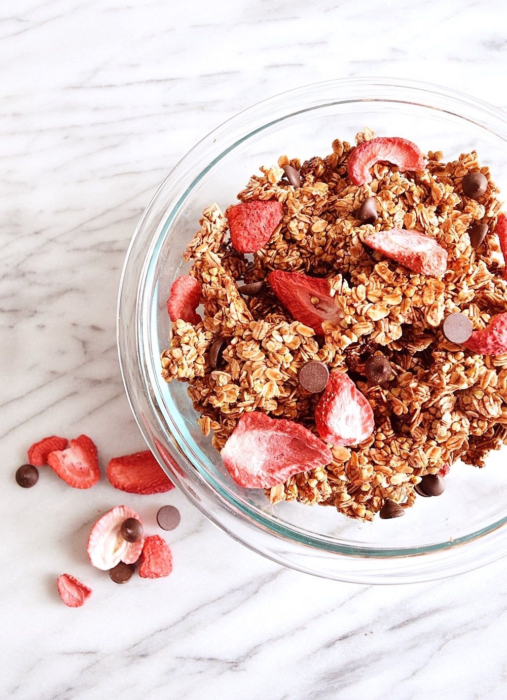 Vegan strawberry chocolate chip granola is sweet, crunchy, and full of strawberries and chocolate chips! Totally nut free and fruit sweetened.
