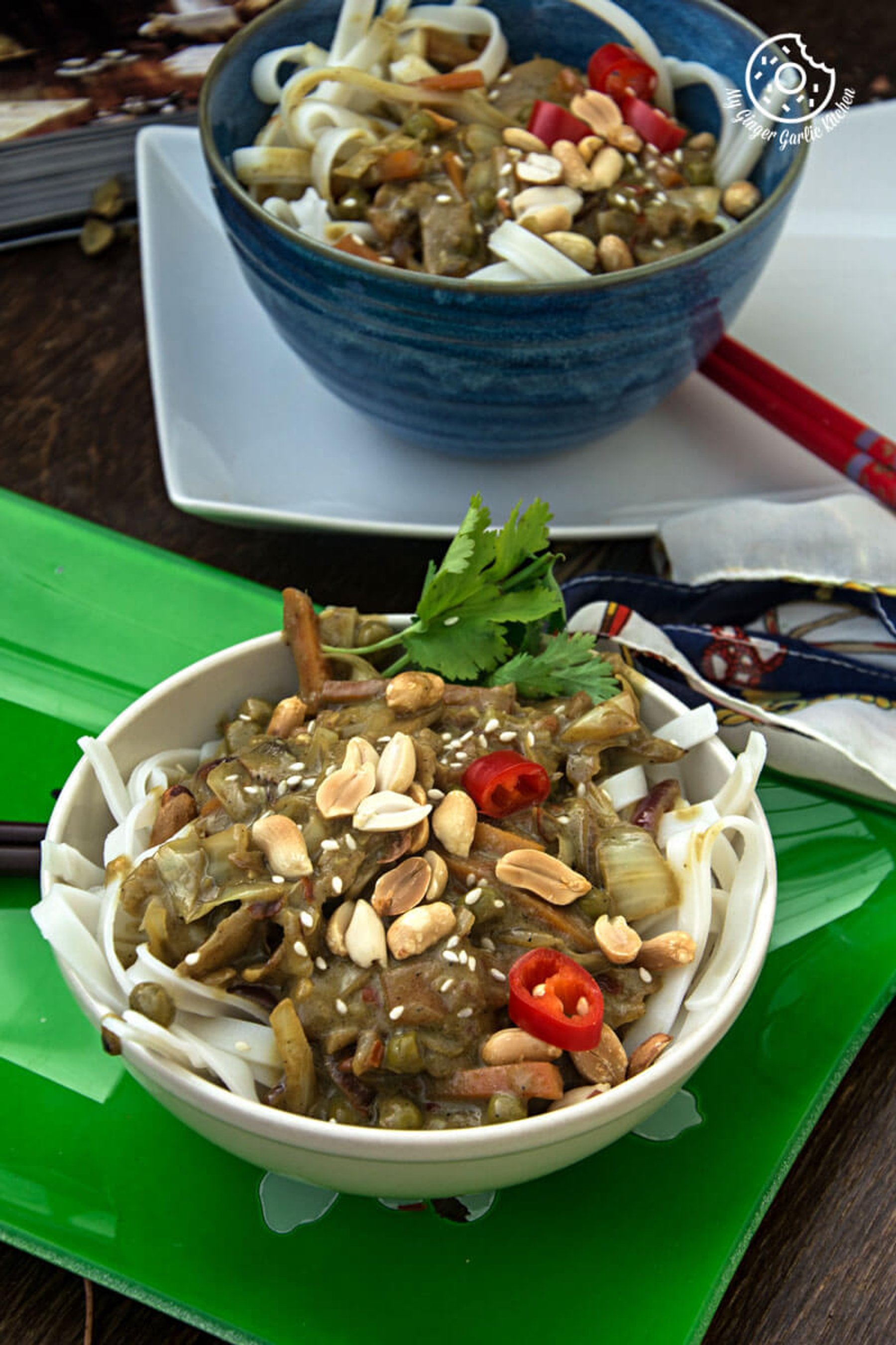 Vegan Thai Green Curry Vegetable Noodles. This bowl is full of rice noodles. The stir-fry has a mix of peanut oil, ginger, garlic, a little rice vinegar, tamari, chili flakes, sesame seeds, salt and pepper and green curry paste and a lot of veggies.