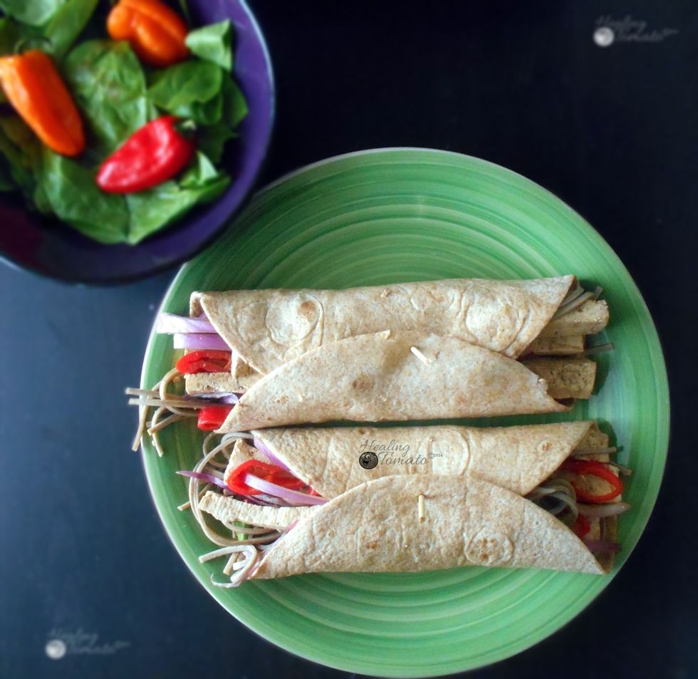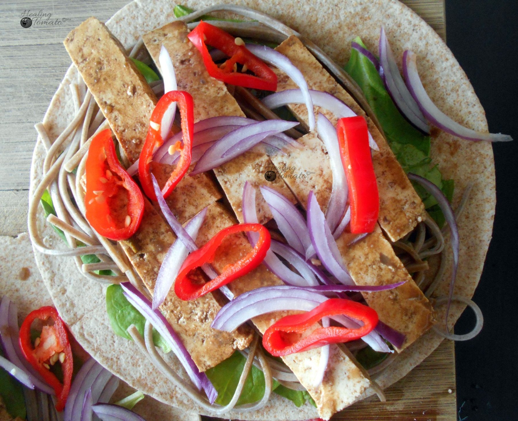 This Vegan Tofu Wraps recipe is rich with Protein. Has Peanut Butter + Soy Sauce Marinated Tofu, Soba Noodles, Hummus, Red Onions & Whole Wheat Tortilla