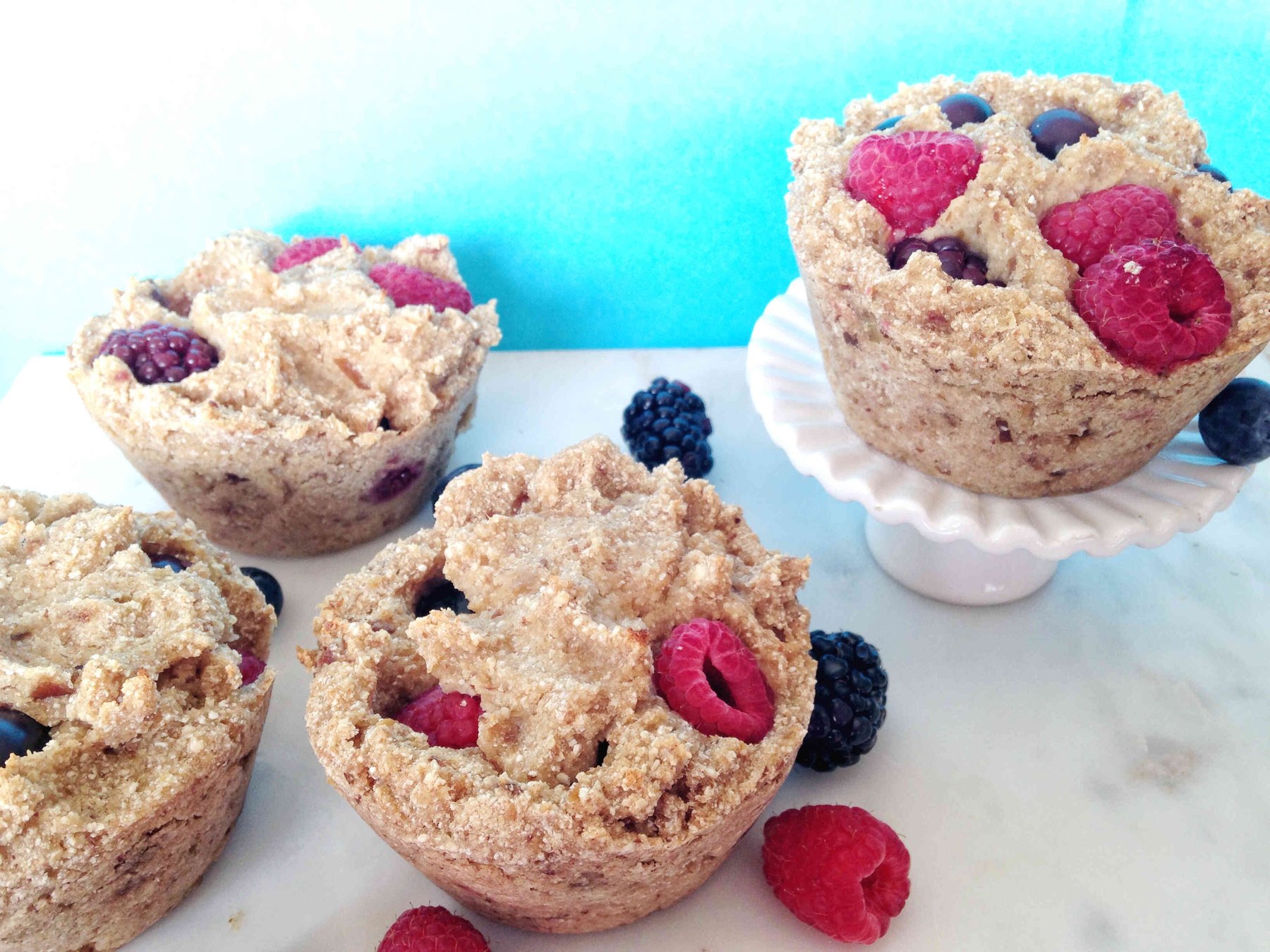 To make the muffins, mix all the ingredients except berries. Place 3-4 berries gently into each muffin cup once the batter is in the pan.