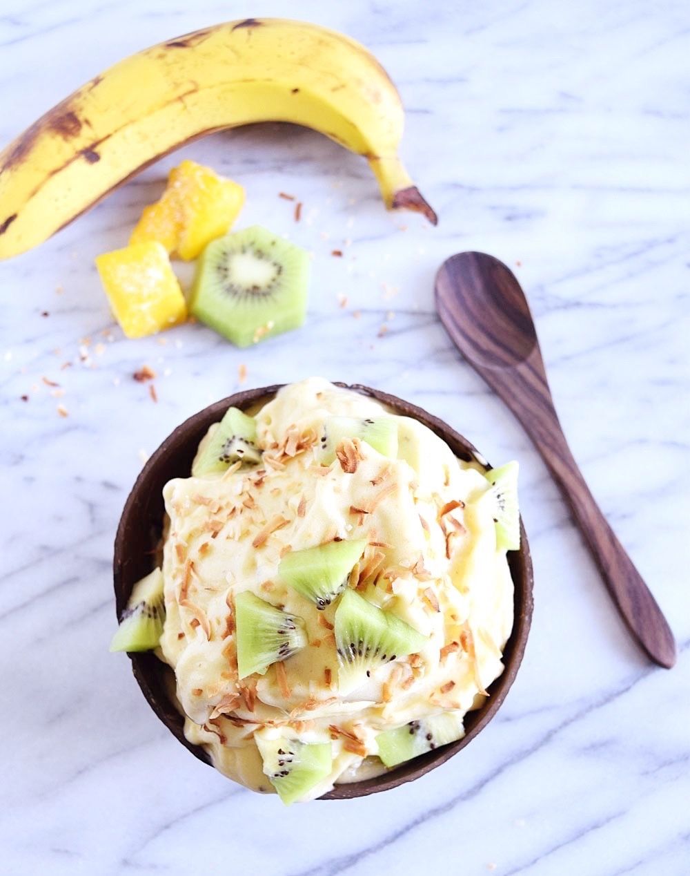 Vegan tropical nice cream is sweet, creamy, and will transport you to your favorite tropical beach. Made with just 4 healthy ingredients, gluten free, and fruit sweetened!