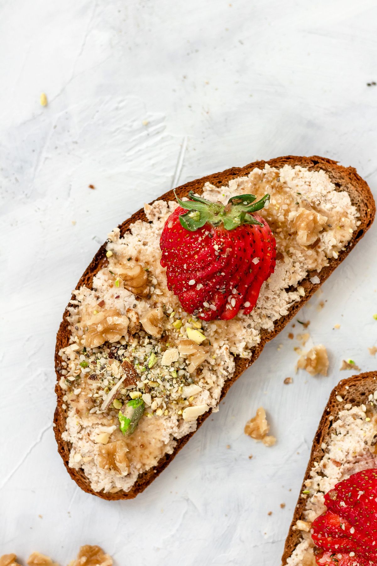 Vegan Walnut Ricotta Toast with Strawberries and Sweet Dukkah