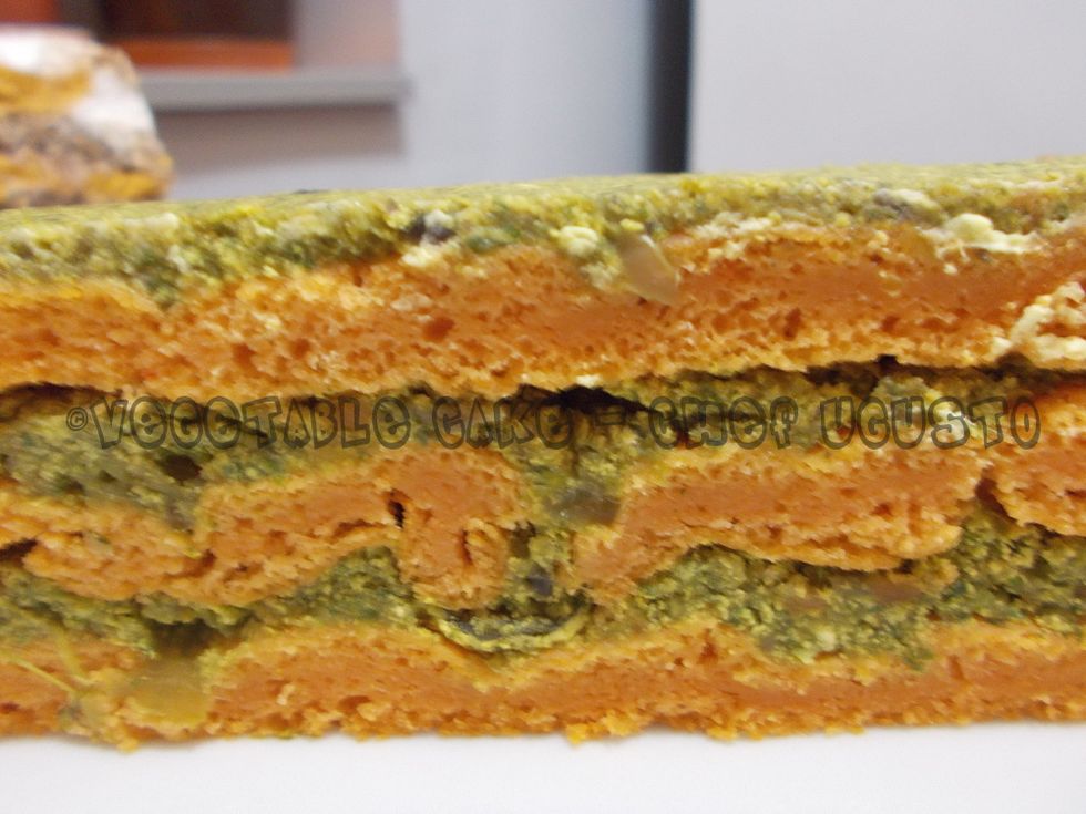 6. Divide the vegetable mixture into 3 equal parts and spread over the cooled tomato sauce biscuits, layering each one on the top of the next, finishing with the last 1/3 of the spread. You can spread some mayo on the top of the cake.