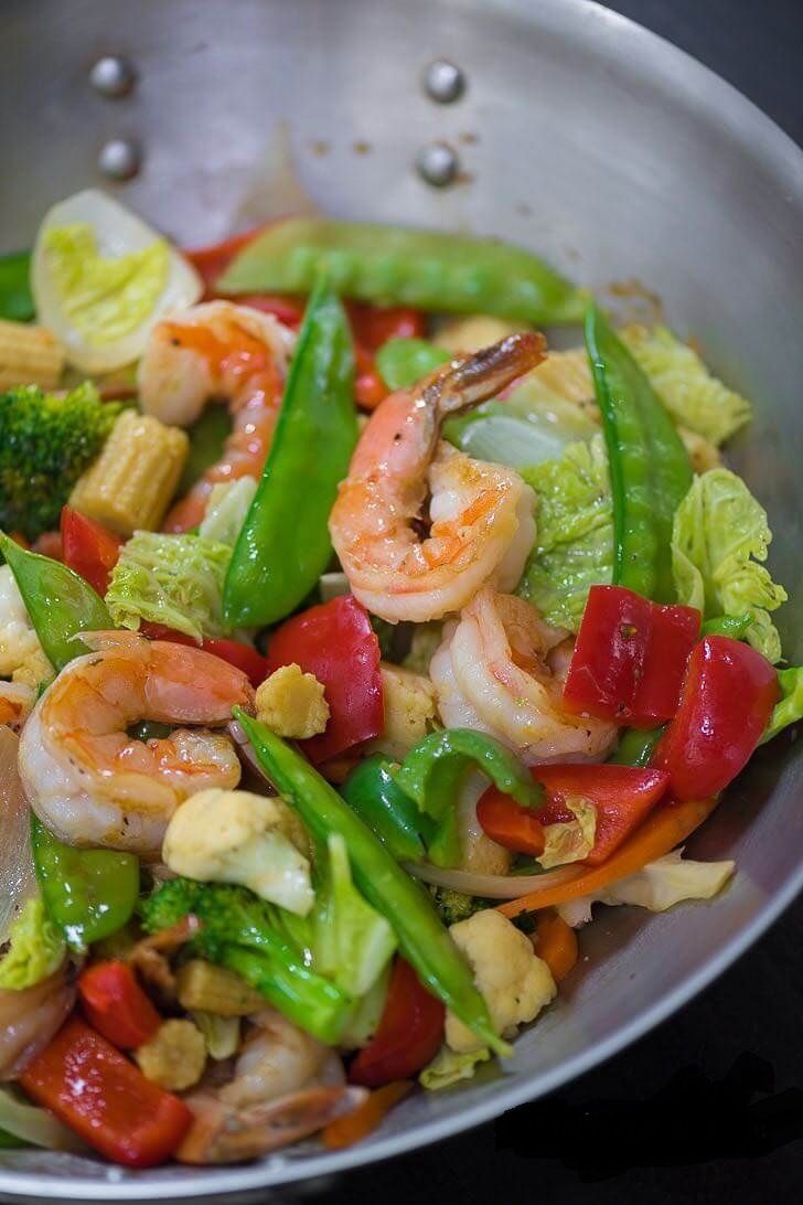 This version combines jumbo shrimp, snow peas, young corn, cauliflower florets, broccoli florets, cabbage, bell pepper, with the mixture of chicken broth—but you should feel free to use whatever veggies or meat you have.