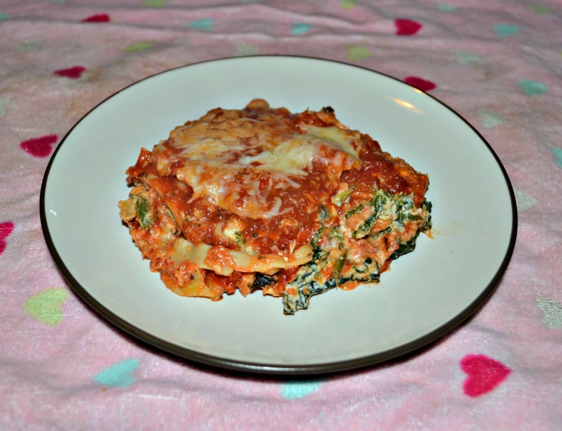 Lasagna made healthier with less noodles, a variety of colorful vegetables, and homemade vodka sauce.