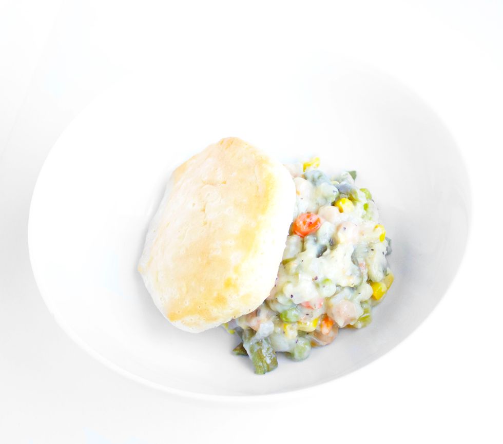 This recipe for vegetable pot pie is a warm bowl of savory vegetables in a thick, creamy, and herb gravy. That gravy is soaked up with a buttery, soft biscuit to complete this addicting dish.