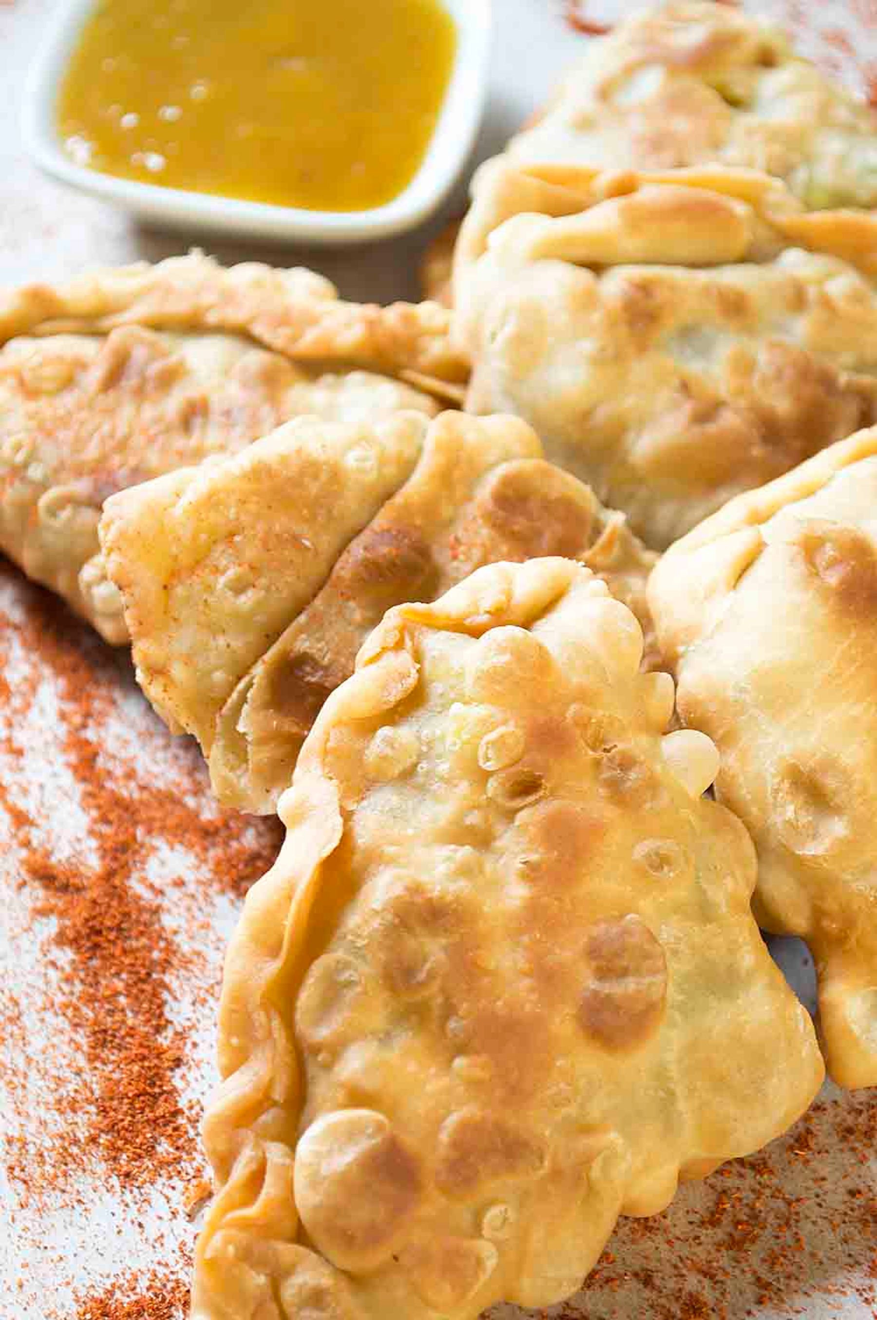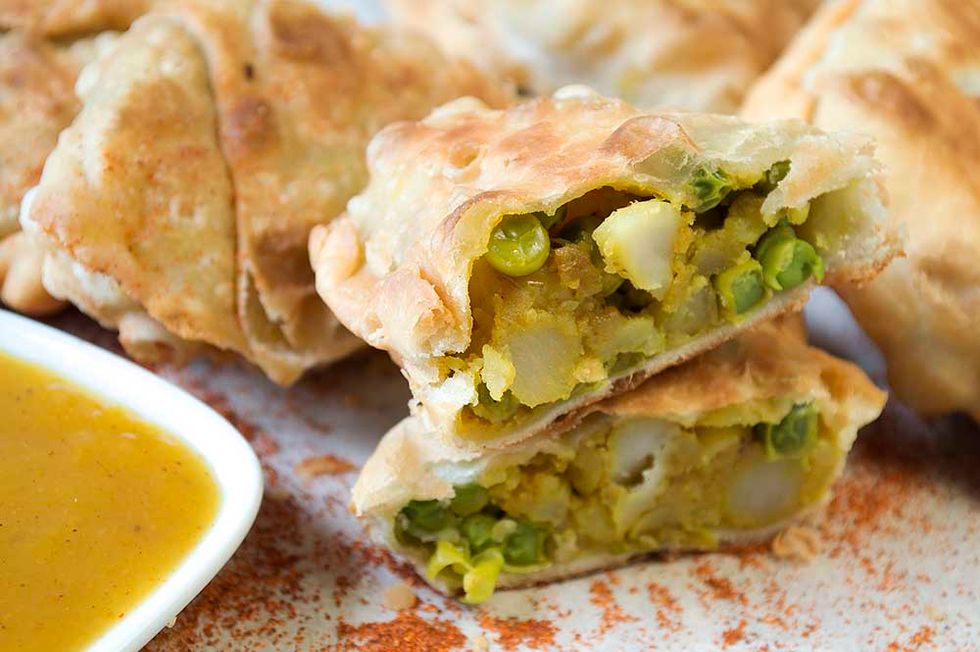 Vegetable samosas, made with potatoes and peas seasoned with just the right blend of spices, and fried to perfection.