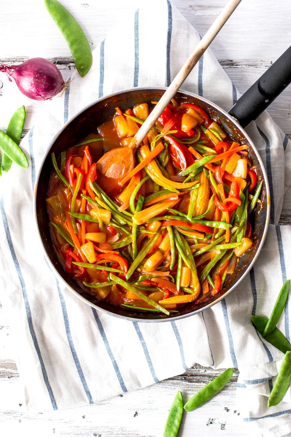 In a large frying pan heat the oil over medium-high heat. Add onion, carrot, pepper and corn to the pan and fry over medium heat until starting to soften, about 3-4 minutes. Add pineapple chunks and fry for...