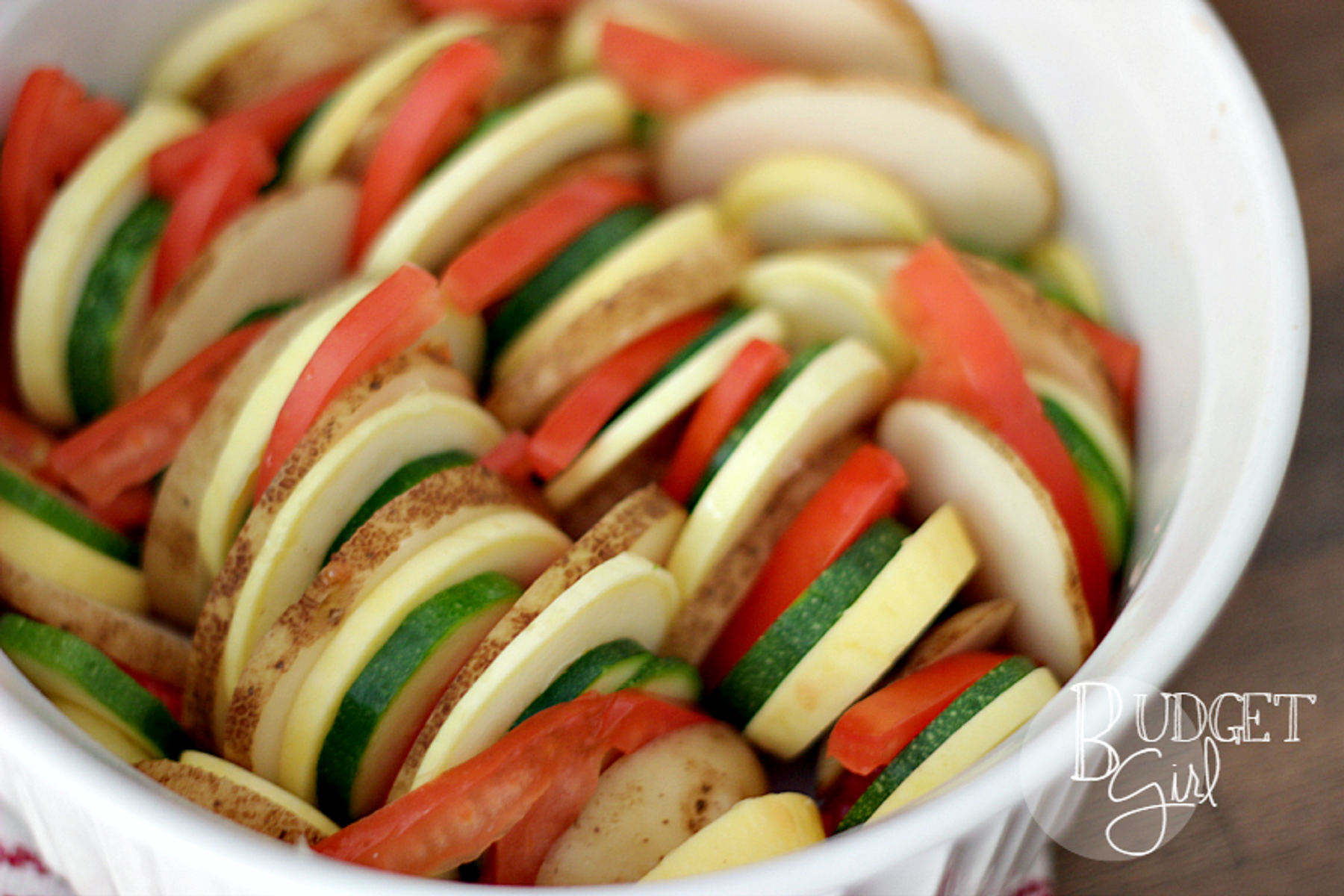 Preheat the oven to 400°F. Slice the veggies about 1/4 inch thick and set in stacks next to your casserole dish. For the tomato, I tend to cut each slice into halves or quarters, depending on how large the...