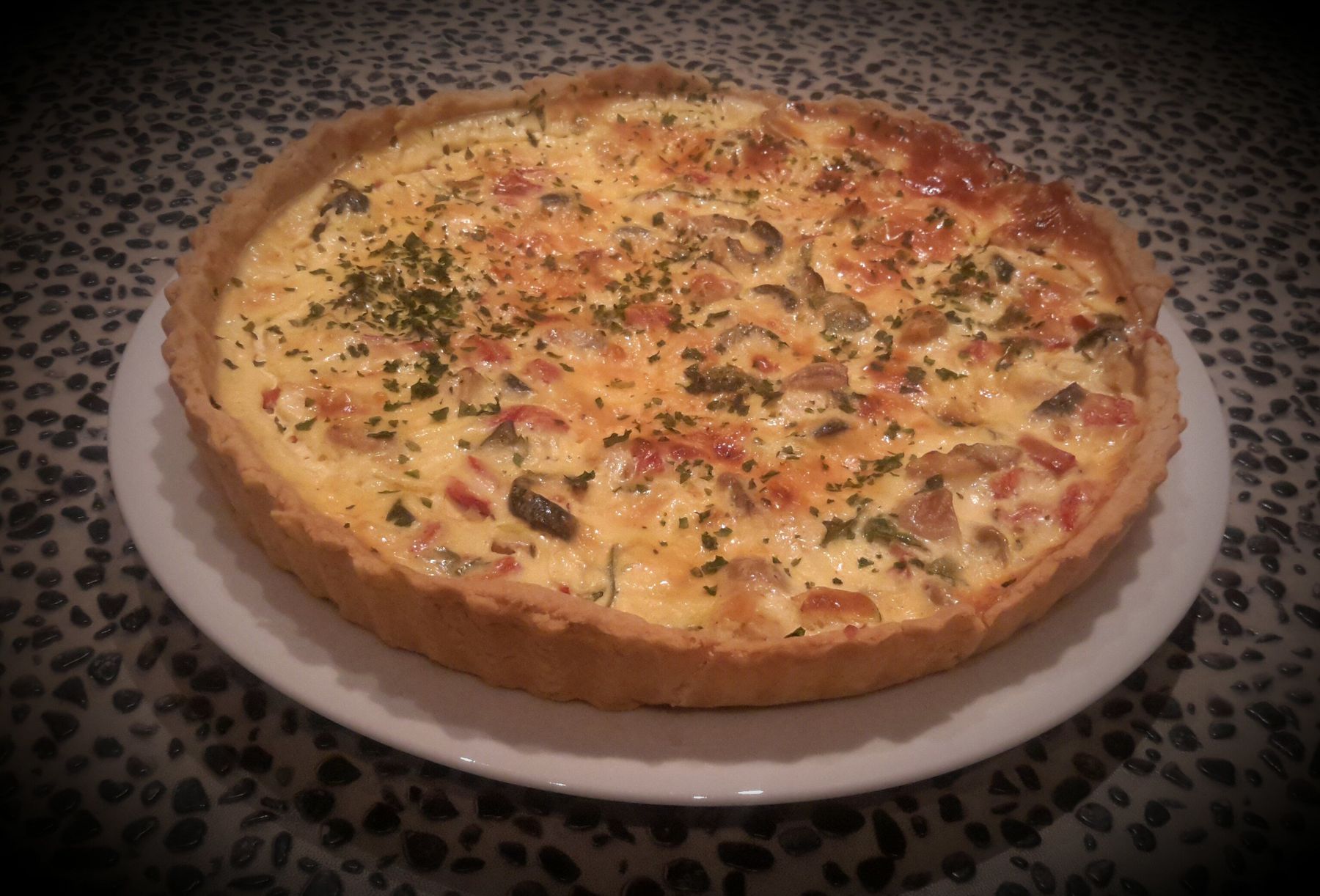 A yummy vegetarian quiche with black olives, roasted red pepper, mushrooms, spinach and courgettes
