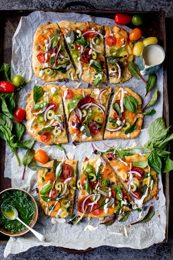 This Vegetarian Summer Tomato Pizza with Basil Garlic Butter and creamy cashew drizzle is a meal even the meat-eaters will love. The homemade no-knead, no-prove flatbread base is super quick to make!
