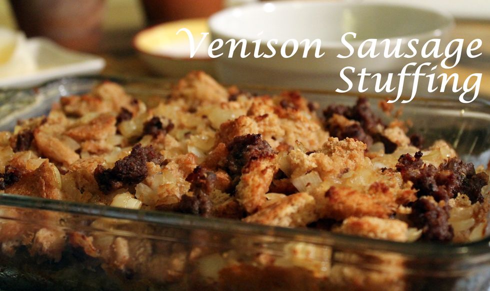 Preheat oven to 350 Degrees. In a large skillet cook and crumble the sausage, adding onion and celery half way through. Discard excess fat if any (venison usually doesn’t have much but beef or pork sausage...