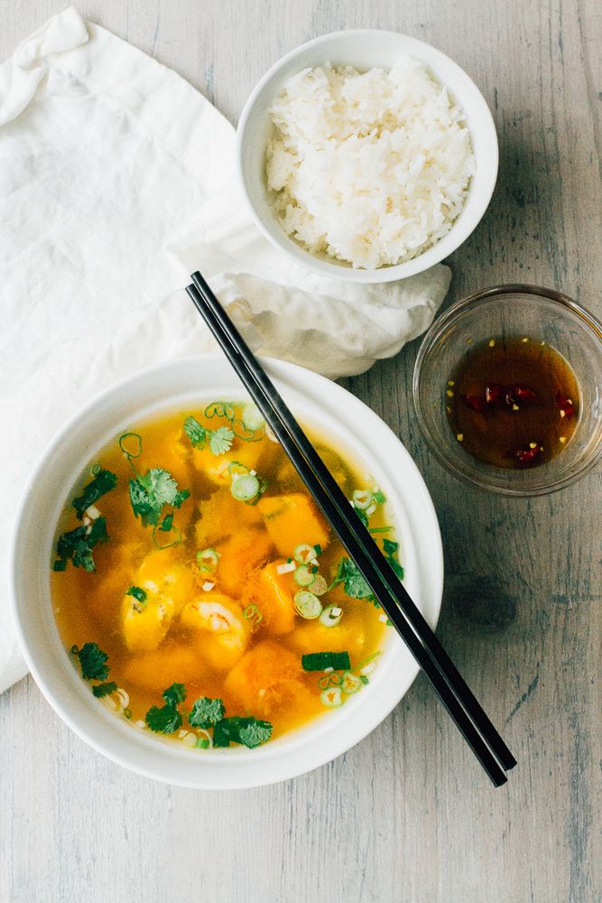 a hearty, but healthy vietnamese kabocha squash soup with turkey meatballs, shrimp, shiitake mushrooms and chicken broth topped with fresh scallions and cilantro