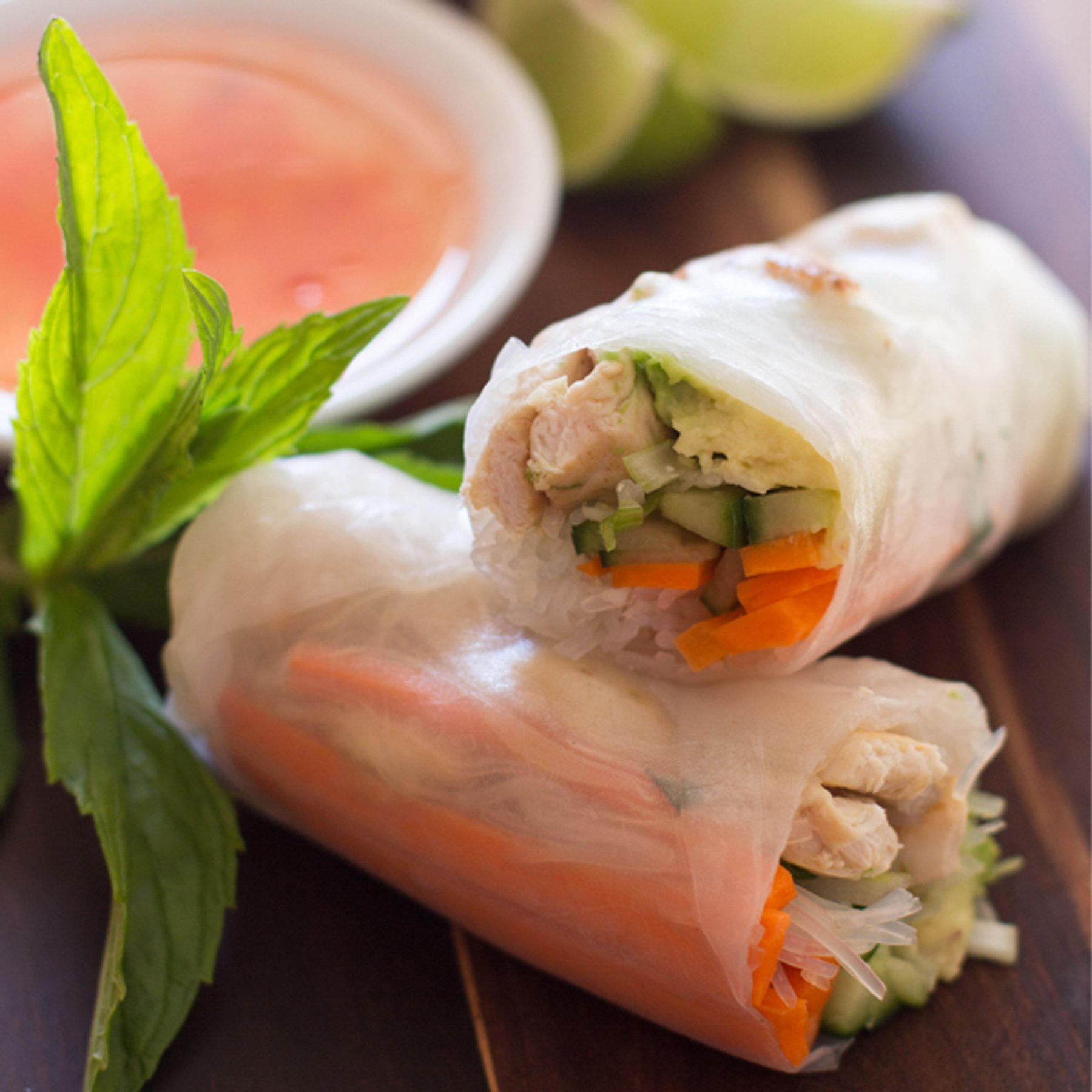 Vietnamese Rice Paper Rolls made with chicken, rice vermicelli and assortment of fresh vegetables and herbs.