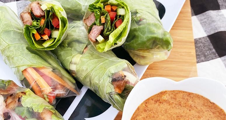 These tasty Vietnamese salad rolls are filled with marinated and grilled Miyazakigyu Wagyu beef, vegetables, rice noodles, and fresh mint and basil. Rolled in a rice paper wrapper, this delicious salad roll is served with a spicy ginger-almond dipping sauce! This recipe works well as an appetizer or main course!