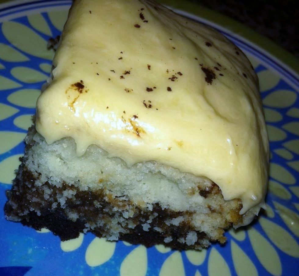 A delicious white cake and cream cheese frosting, with a chocolatey brownie surprise inside. My family absolutely loves this cake!!!