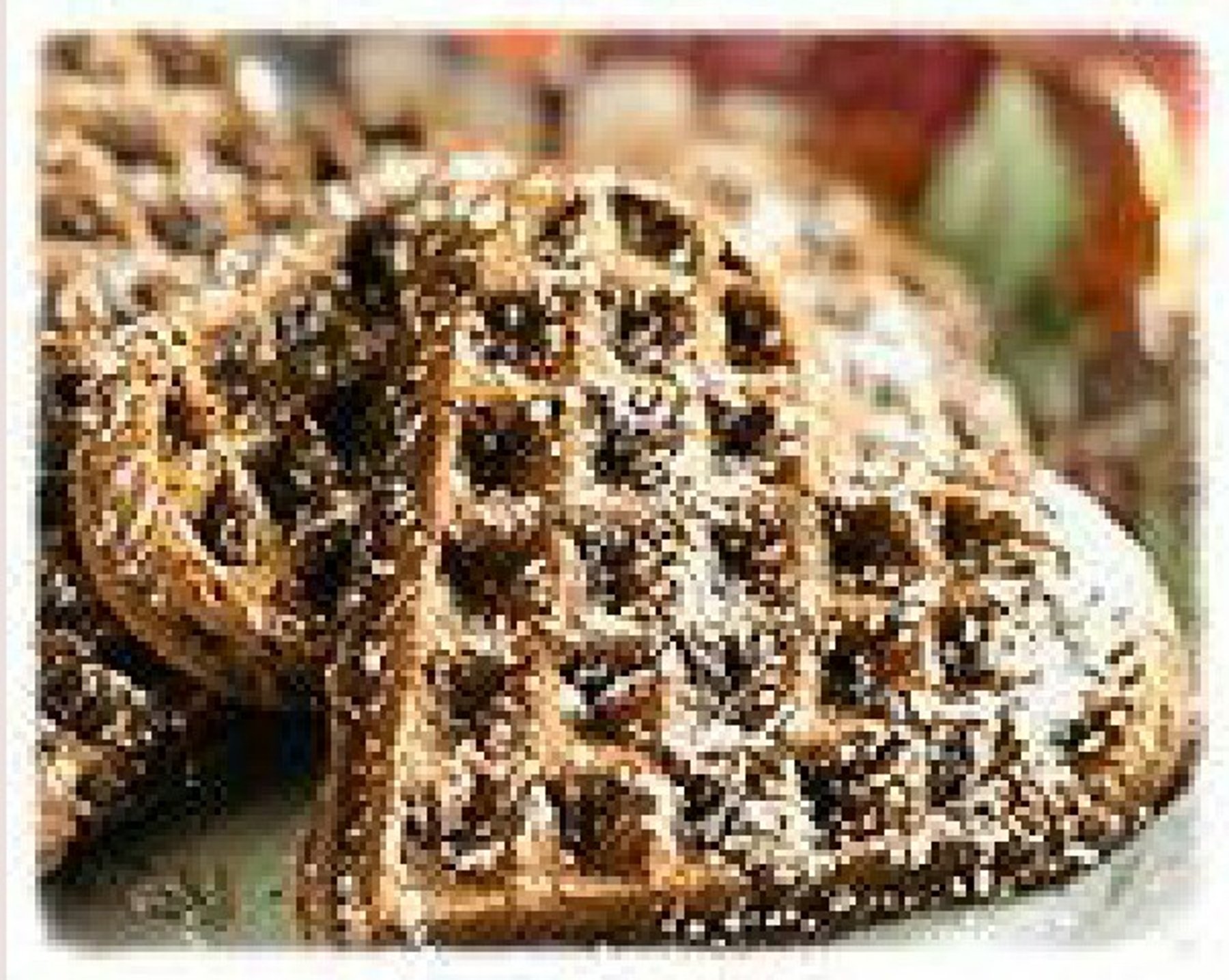 a medium-size mixing bowl. In another medium-size mixing bowl, whisk the melted butter, eggs, ssou cream, vanilla extract, and milk. Pour the whisked mixture over the sifted mixture, add the chocolate chips, and stir to form a batter, using a wooden spoon or flat paddle, mixing until the particles of flour are absorbed. Be sure to sweep the bottom and sides of the mixing bowl to thoroughly incorporate the dry ingredients. Preheat a deep-pocketed waffle iron composed of two 4 1/2-inch squares