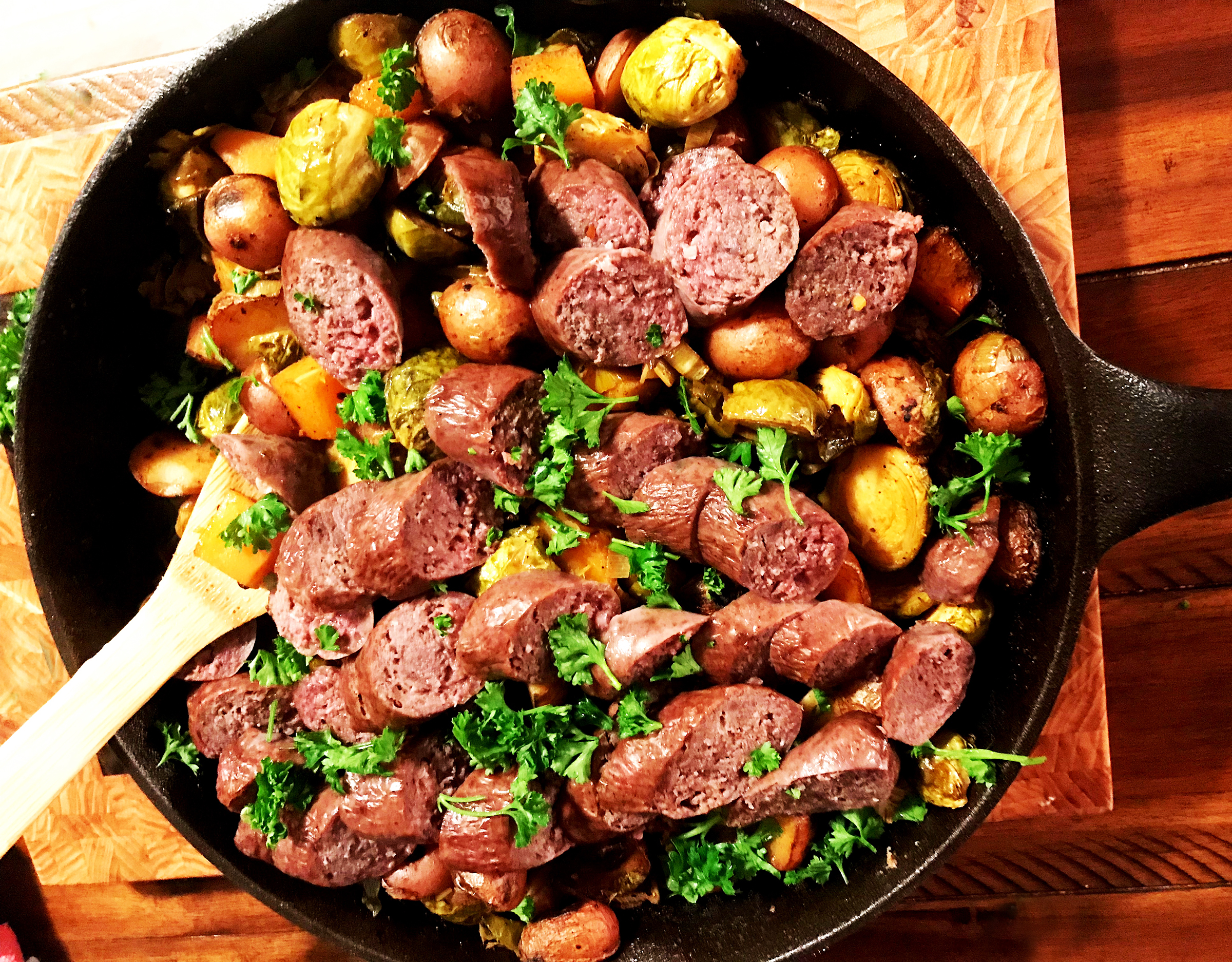 Wagyu Cajun Sausage, Potato, Squash & Sprouts Skillet