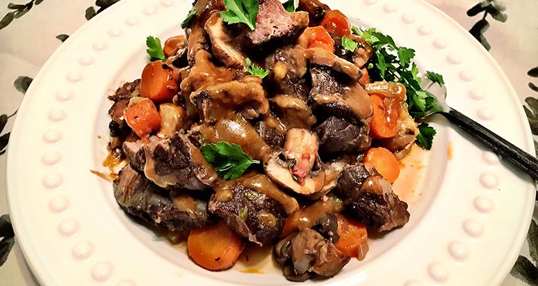 Beef bourguignon is a French-style beef stew braised in red wine. Keeping this recipe traditional, the Fullblood Wagyu beef shank is simmered in red wine and flavored with onions, garlic, mushrooms, and carrots. Serve the tender, melt-in-your-mouth meat over sliced bread, mashed potatoes, or noodles for a delicious, palate-pleasing dish!