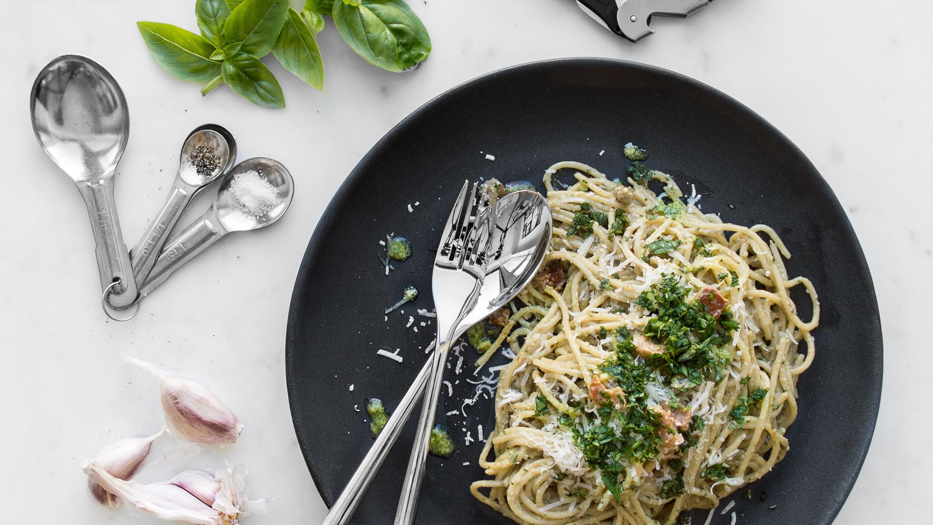 The freshness of basil with the heritage eggs and pancetta makes this walnut pesto carbonara an easy and super indulgent weekday dinner treat.