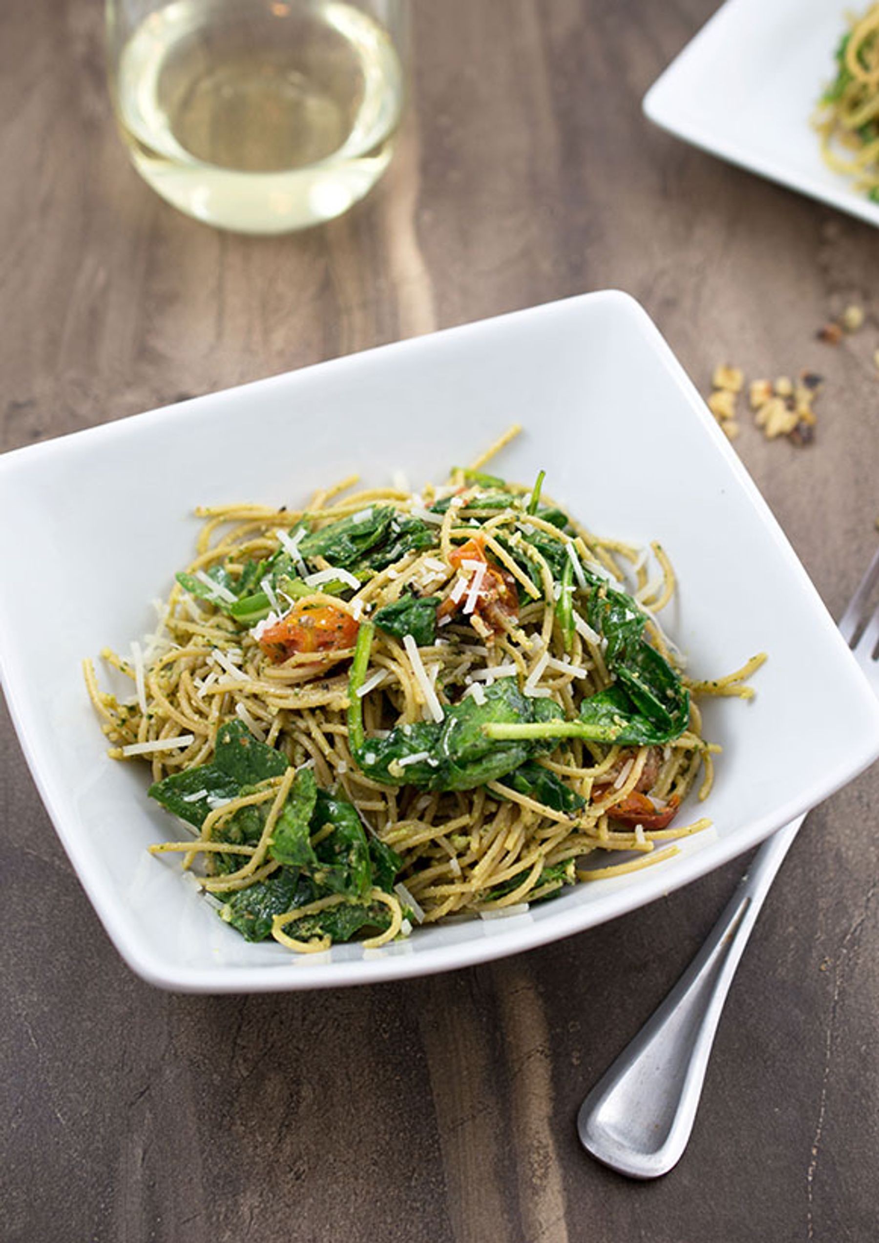 Walnut Pesto Pasta With Roasted Tomatoes and Wilted Greens