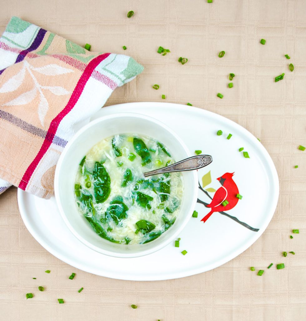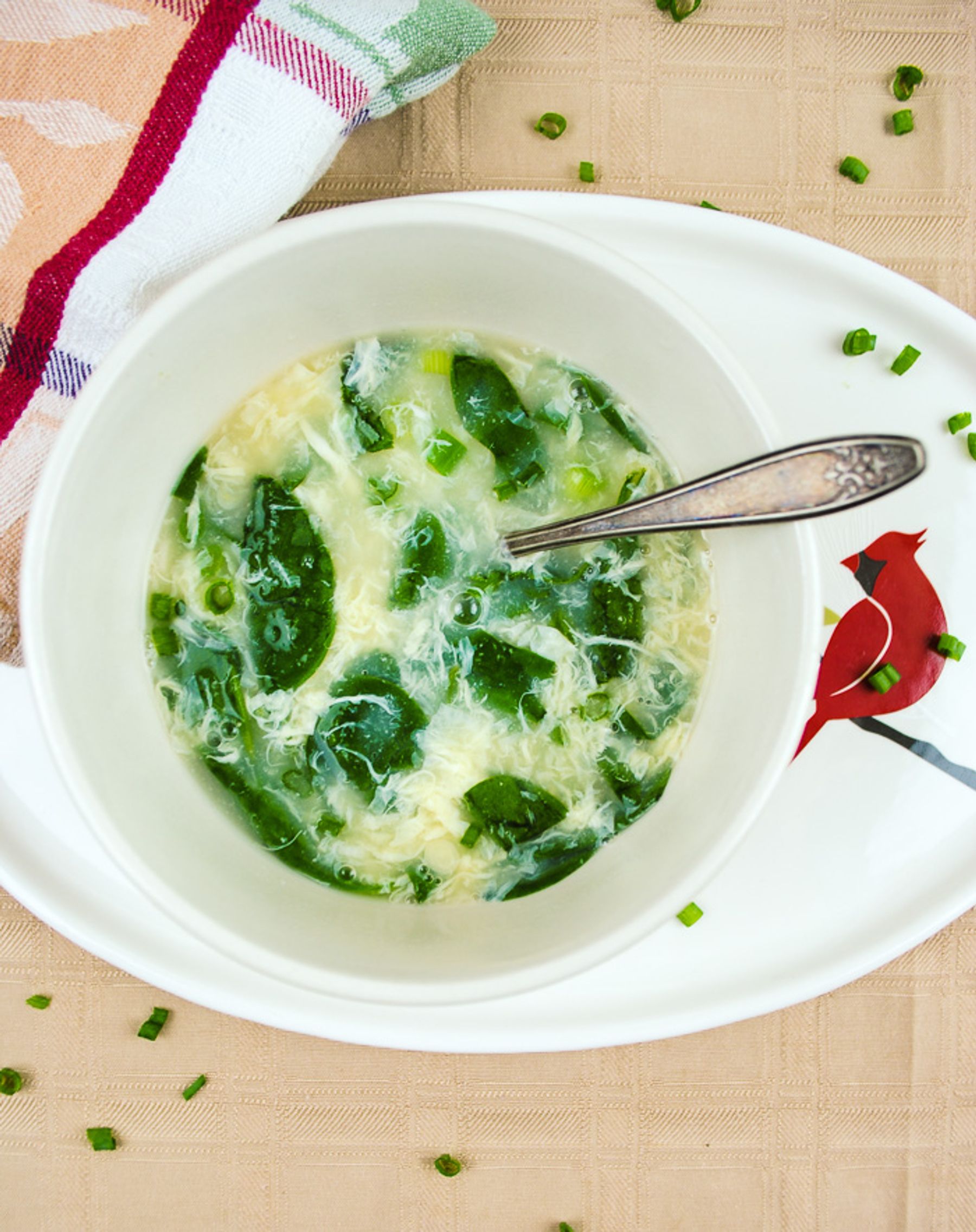 This easy egg drop soup comes together in minutes with a savory miso paste, spinach, and green onions.