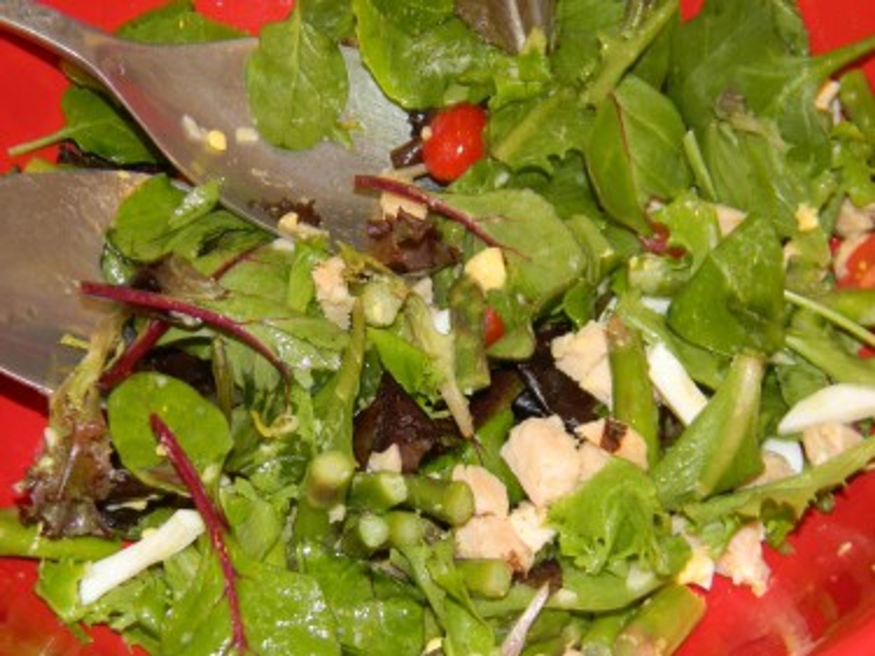 Make the dressing. Whisk together the first 6 ingredients and set the dressing aside. Trim your asparagus of its woody end. I hold the end of the asparagus with one hand and just below the head with the...