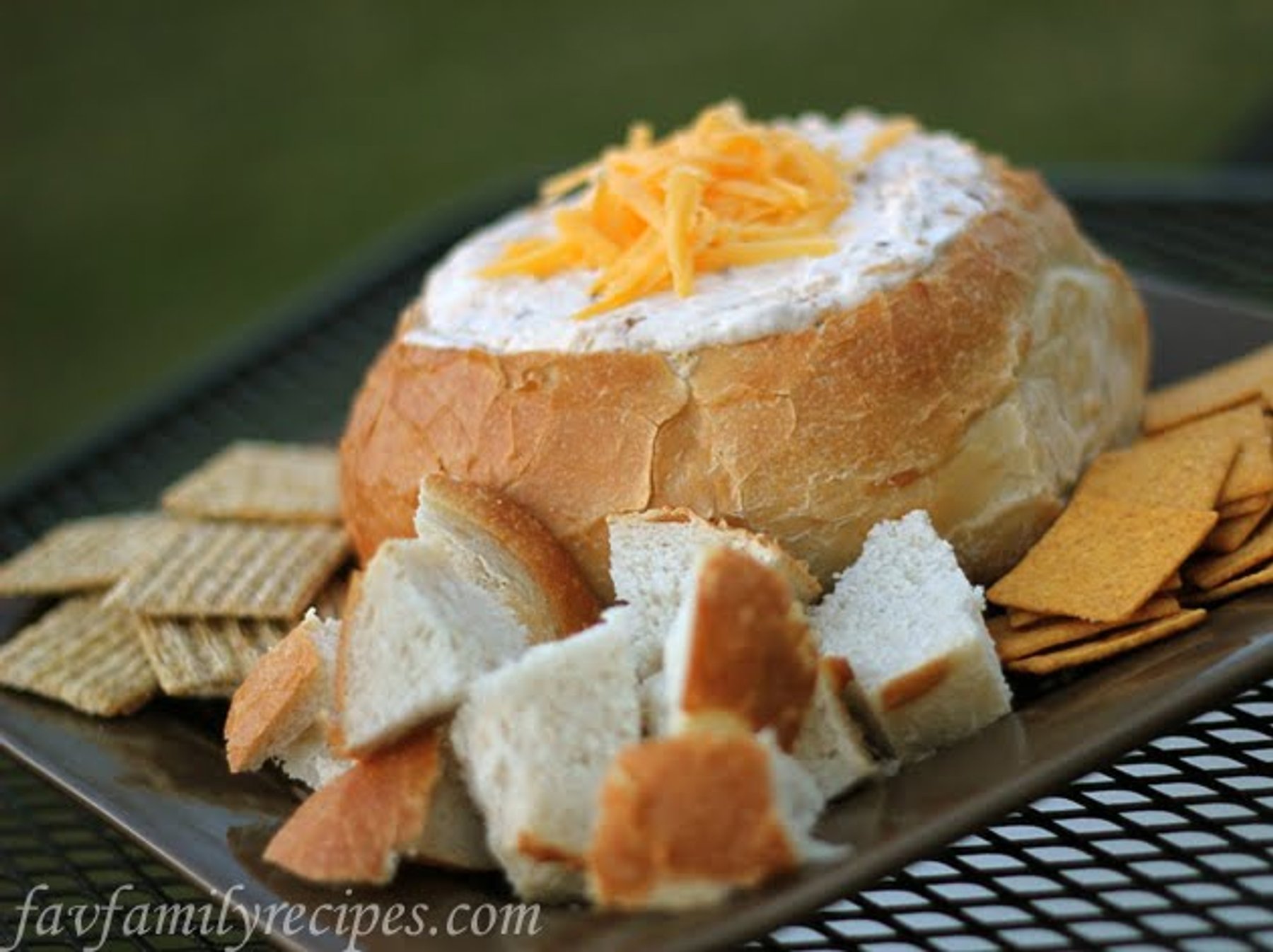 Cut out a circle in the top of the bread and gut out the middle to make a bread bowl (save inside pieces of bread for dipping). In a mixing bowl beat cream cheese, sour cream, cheddar cheese, and...