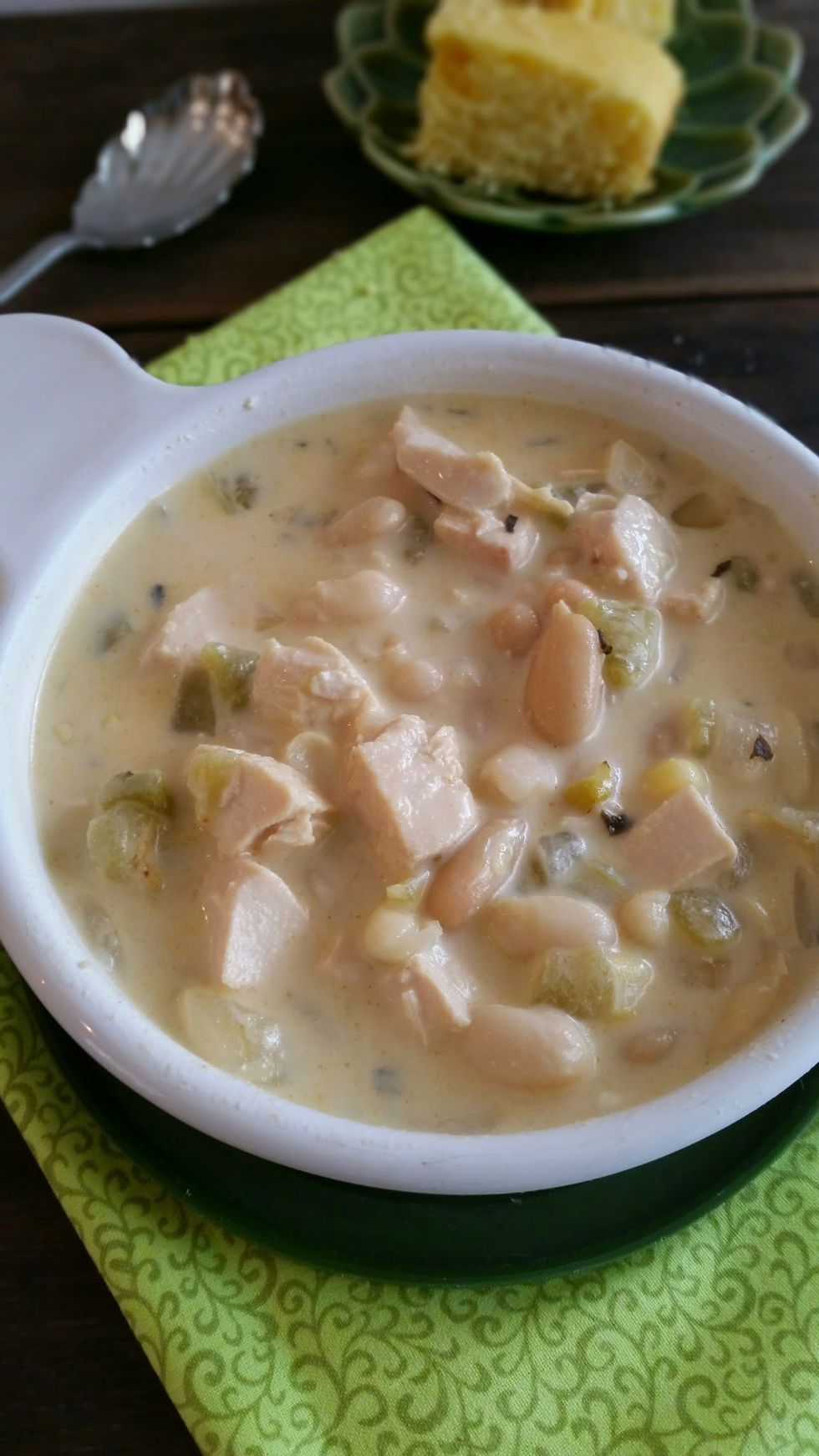 Nothing says comfort like a bowl or mug of something warm! As I look out the window at our snowy wonderland I am thankful for dishes like chilies, stews and soups. This creamy white chicken chili is the perfect hearty meal to keep you warm! Chunks of chicken, three types of white beans, two cheeses, and green chilies for a little bit of a kick make this white chicken chili flavorful and oh so good to eat! Do you have leftover turkey from your Thanksgiving dinner? Make this white chili and add