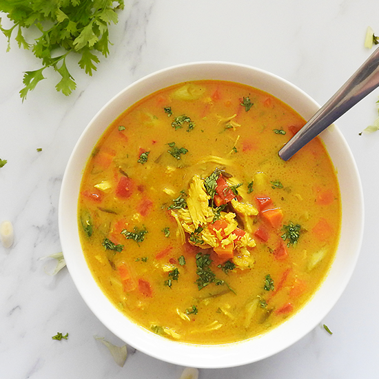 A beautifully warming slow cooker coconut chicken soup – super easy to make and perfect to take to work with you for a satisfying lunch on those crazy busy days! The creaminess from the coconut milk combined with a small kick from the chilli and turmeric will surely make this a staple in your meal planning.