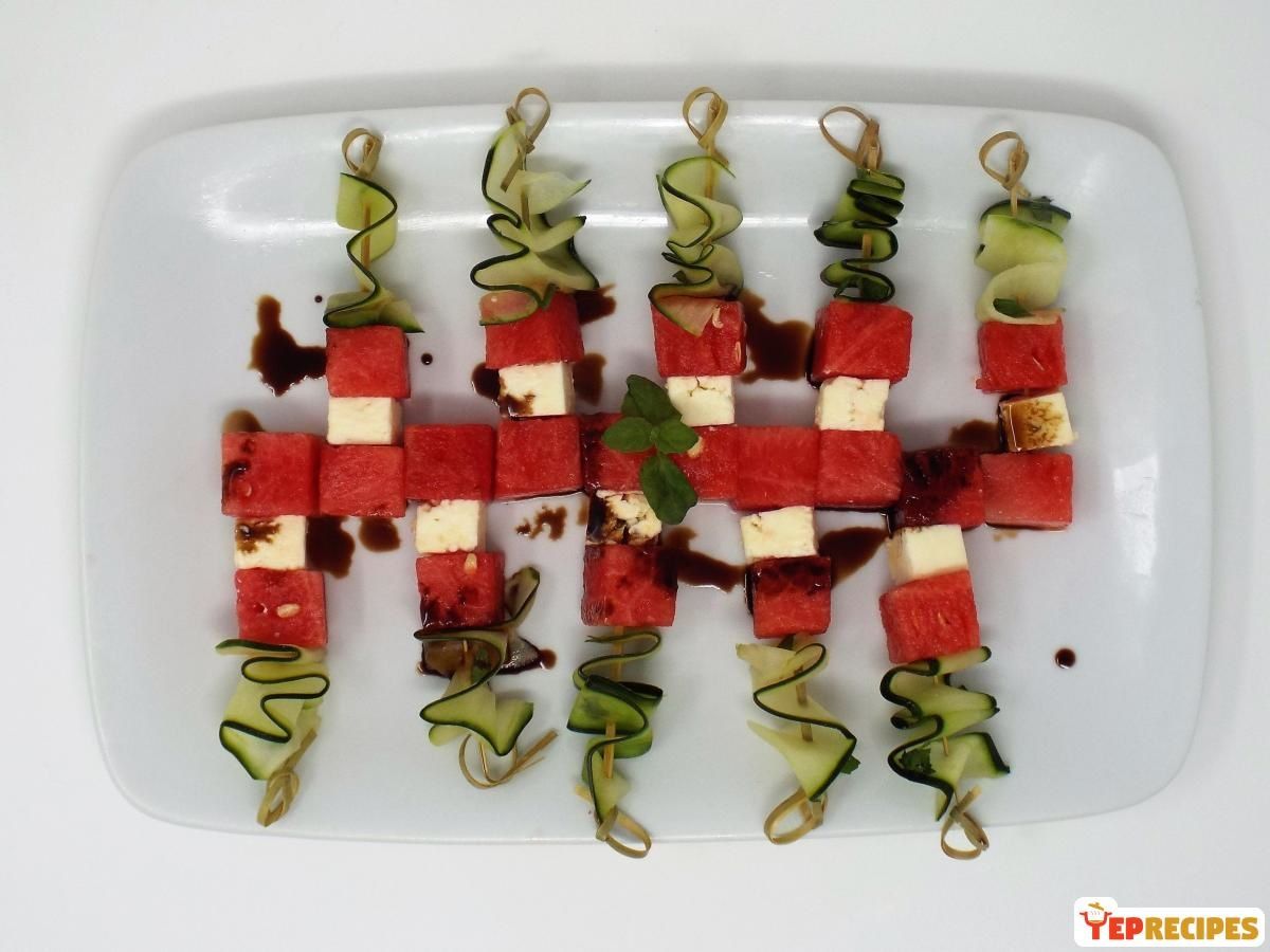 Cubes of watermelon and feta cheese with cucumber ribbons, mint and balsamic reduction.
