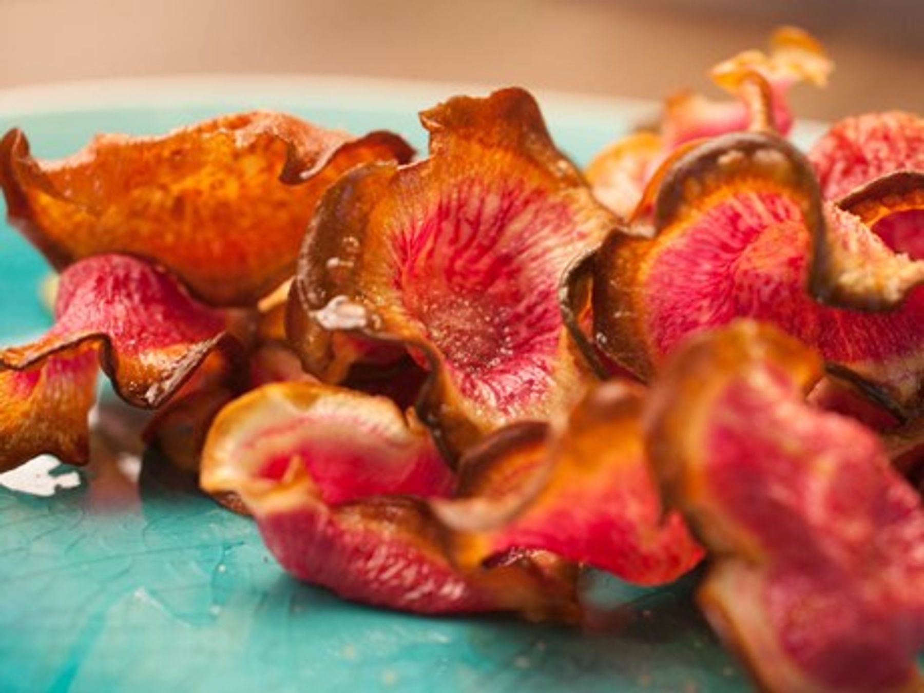 Part of the turnip family, watermelon radishes have a stunning pinkish red interior that makes them appealing and attractive. They are great sliced thinly in salads or for quick pickles but they also make a surprising and exotic appetizer. For these chips, I thin-sliced the radishes with a mandolin, but they are even better a little bit thicker. Though a mandolin makes this recipe easier, a sharp knife will do just fine. Most chips would call for just salt, but we'll kick these up a notc