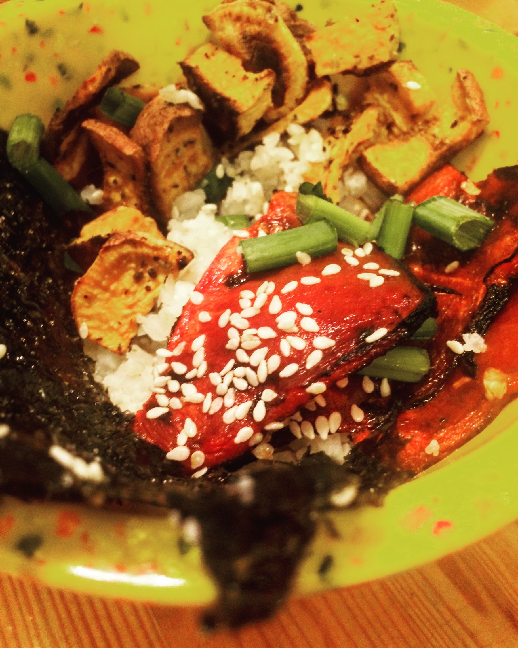 Watermelon "Tuna" Poke Bowl with Savory Sweet Potatoes