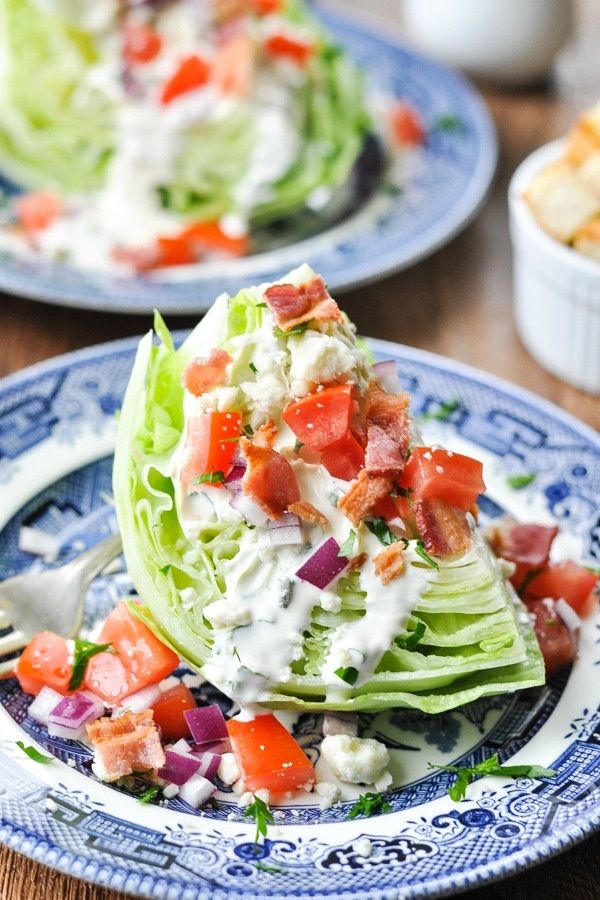 This classic Wedge Salad recipe is the perfect side dish for your next meal! Crisp iceberg lettuce is topped with blue cheese, bacon, tomatoes and red onion, and then finished with a homemade buttermilk ranch dressing. It's cool, creamy and full of flavor and texture!