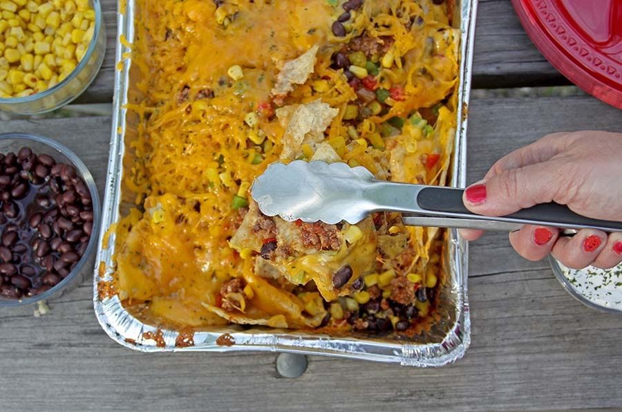 Easy Nachos on the Grill is an awesome weeknight meal or cookout appetizer that's ready to serve in about 15 minutes. Cheesy, beefy and so delicious! These nachos start with a Crockpot taco meat and disposable aluminum pan so prep and clean-up are a snap!