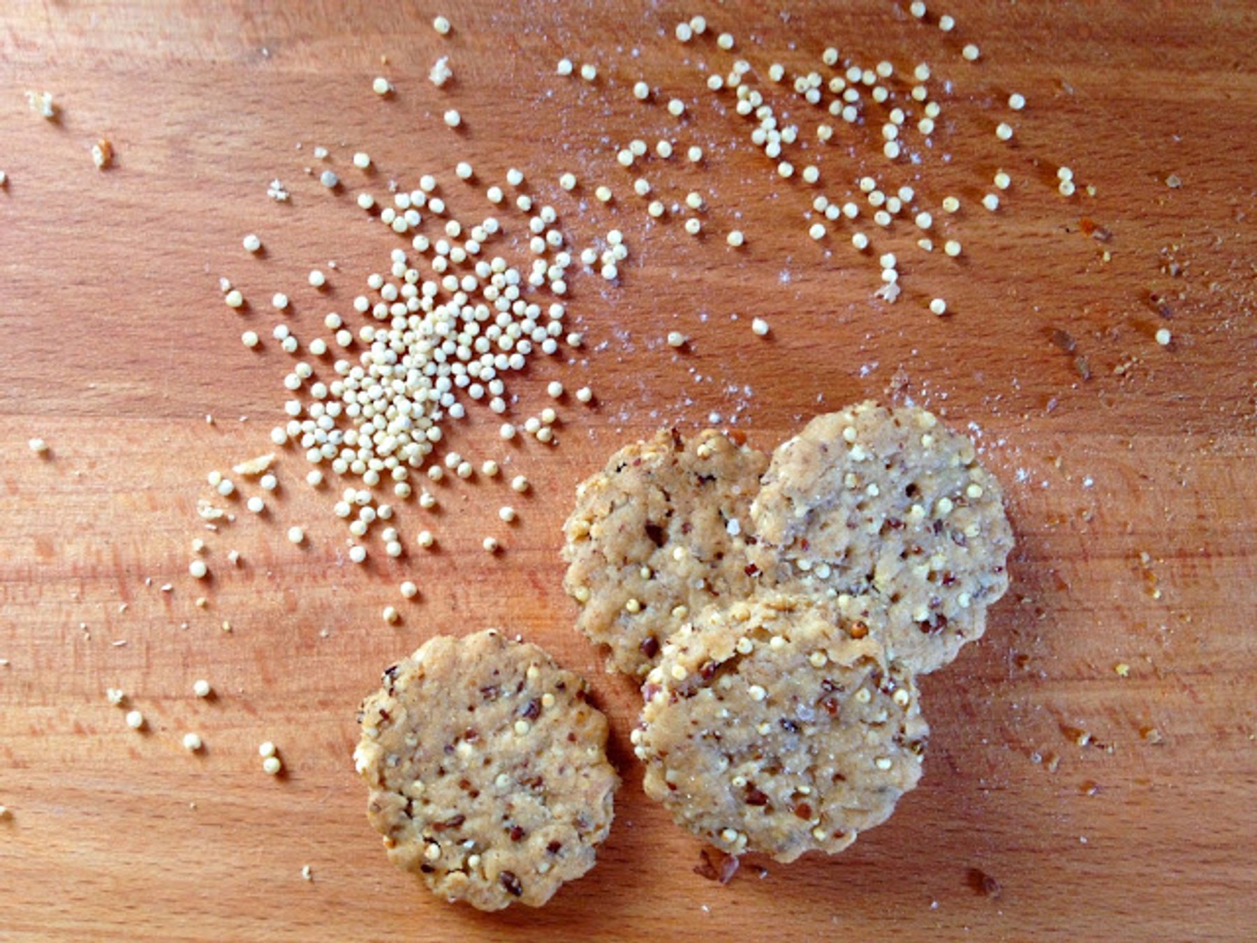 Preheat the oven to 350. In a medium bowl or Kitchen Aid, combine the two flours, baking powder, millet, flax, & salt. Add the olive oil & combine. Add 1/2 cup water & continue to add more water (up to 1/4...