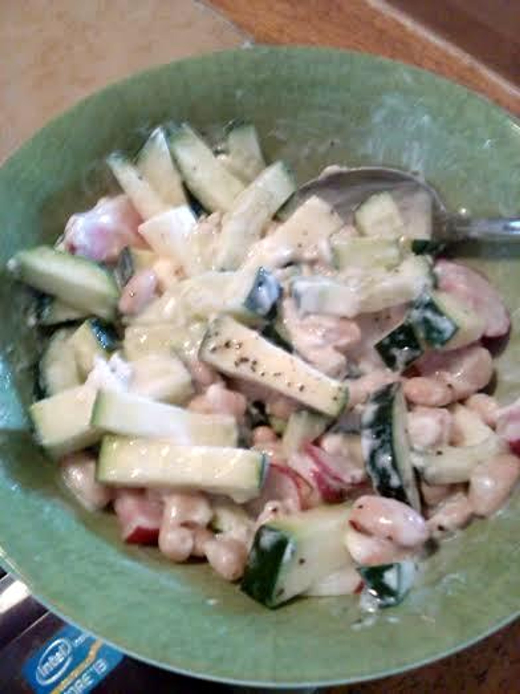 Combine half cup cooked, drained white beans with 1/4 cup diced cucumber, diced zucchini and small handful of thinly sliced radish. Toss with a tablespoon of olive oil, tablespoon of mayonnaise or salad dressing, a teaspoon of Ranch dressing, salt and pepper to taste.