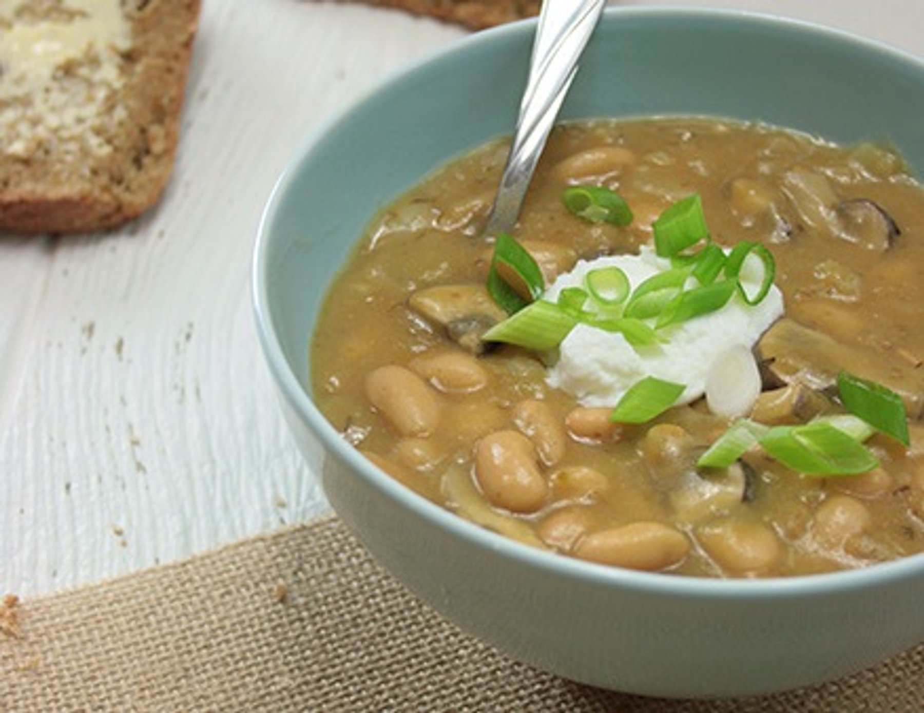 A vegan version of a white chicken chili. Who needs chicken when you have mushrooms and a double dose of white beans? This hearty, filling meal is full of flavor everyone will enjoy.