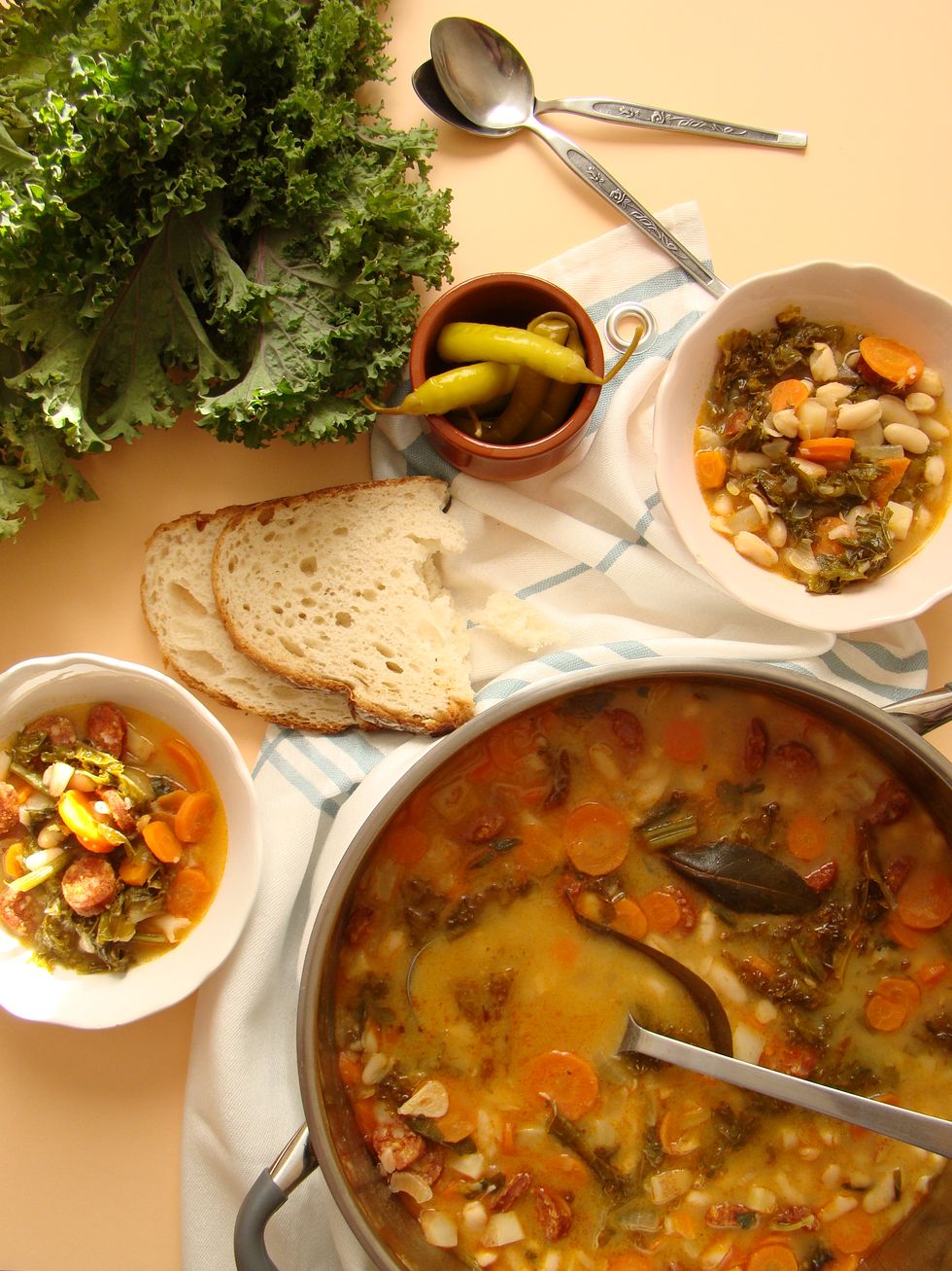 In a large pot add the sausage, garlic, onion, celery, and carrots and saute for 10 minutes. Season with salt and pepper and add the bay leaves.