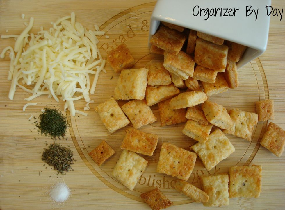 In your mixer combine the cheese, butter and shortening on medium. Add in the flour, salt, basil, dill and garlic powder and reduce the speed to low. Mix until it becomes a crumb like consistency. Add in...