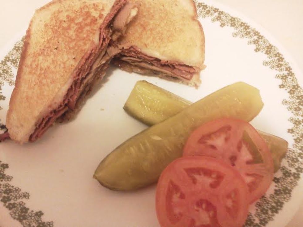Step 2: Butter the sliced bread add to a hot pan or griddle butter side down, next layer the cheese both sides of the bread add pastrami, roast beef, submarine sauce and onions and cook until both sides of the bread are golden brown.